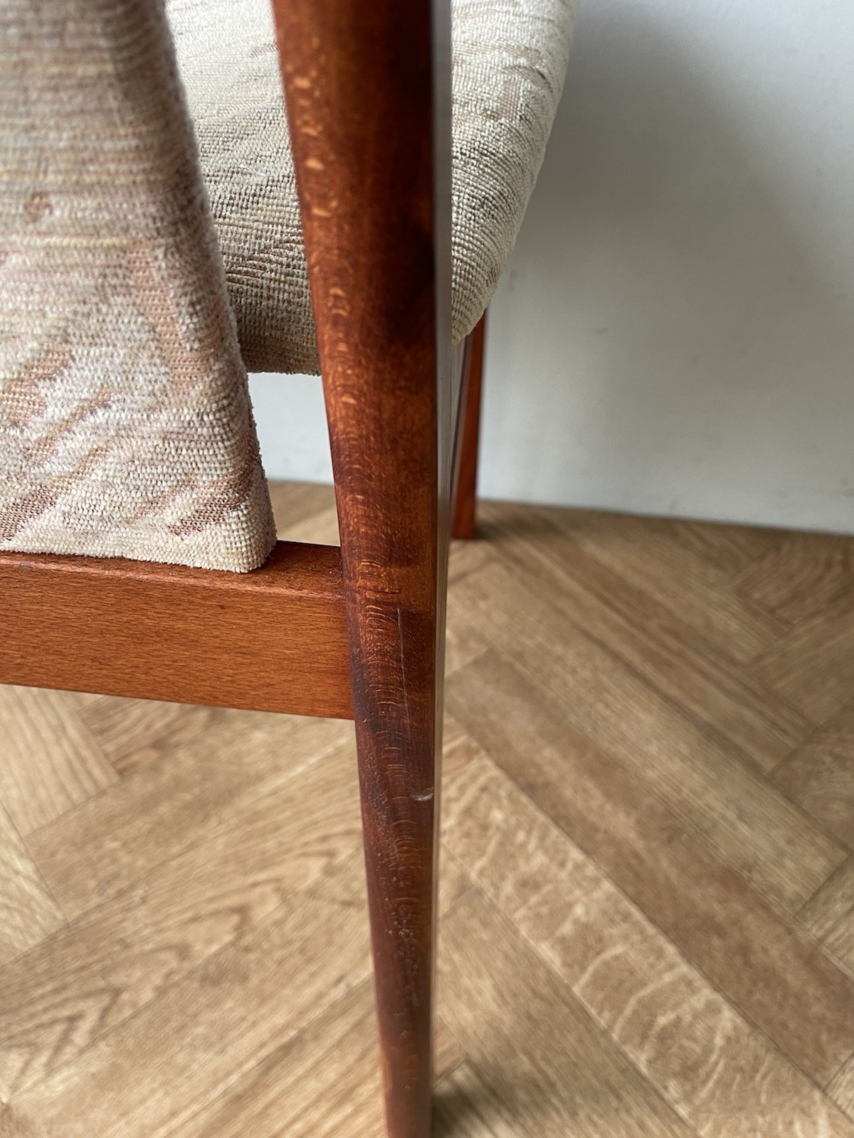 In used vintage condition, the chairs are structurally sound. There are signs of wear, some surface scratches, marks and scuffs. The upholstery has various marks, please see photos, these form part of the description.