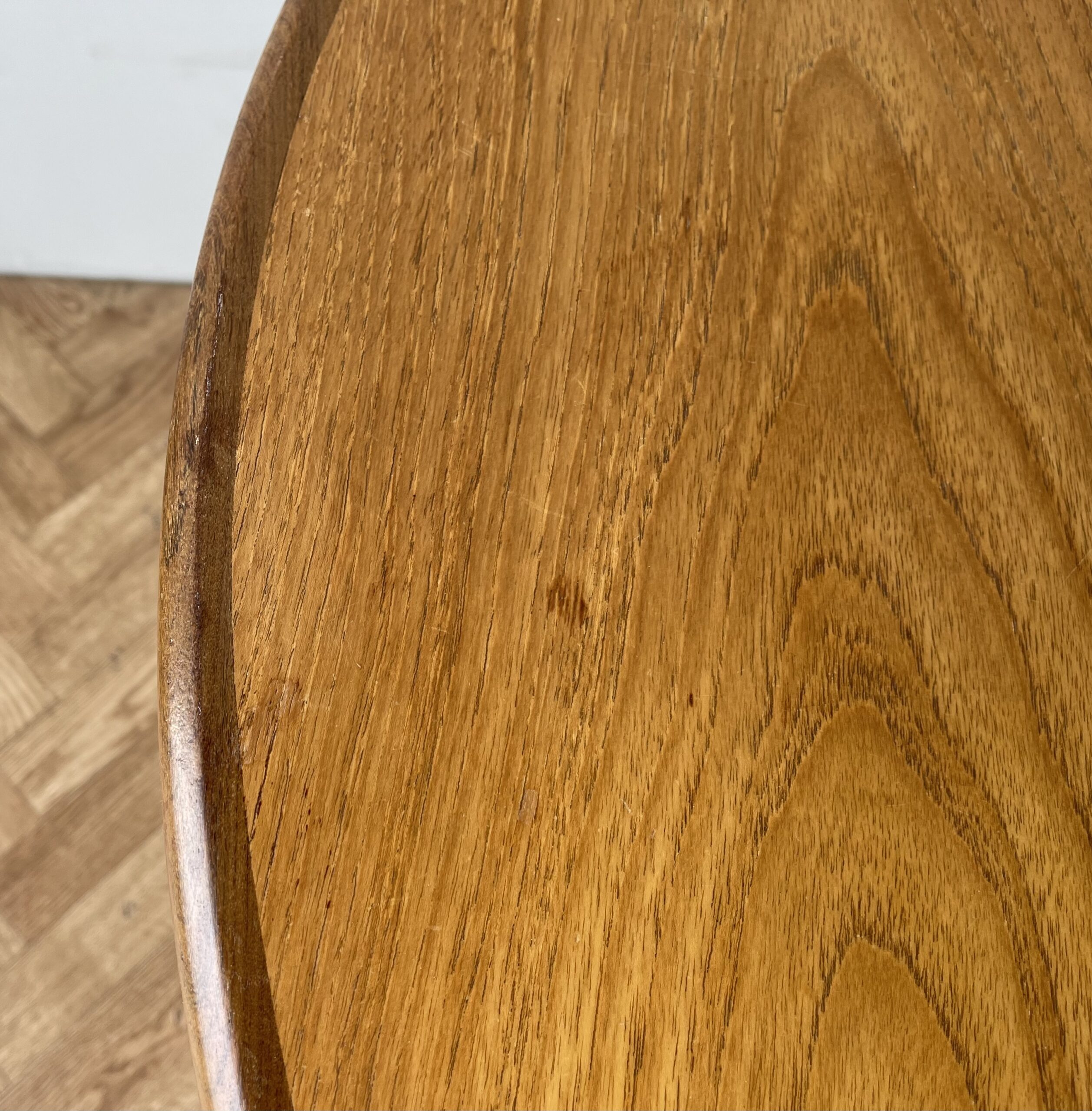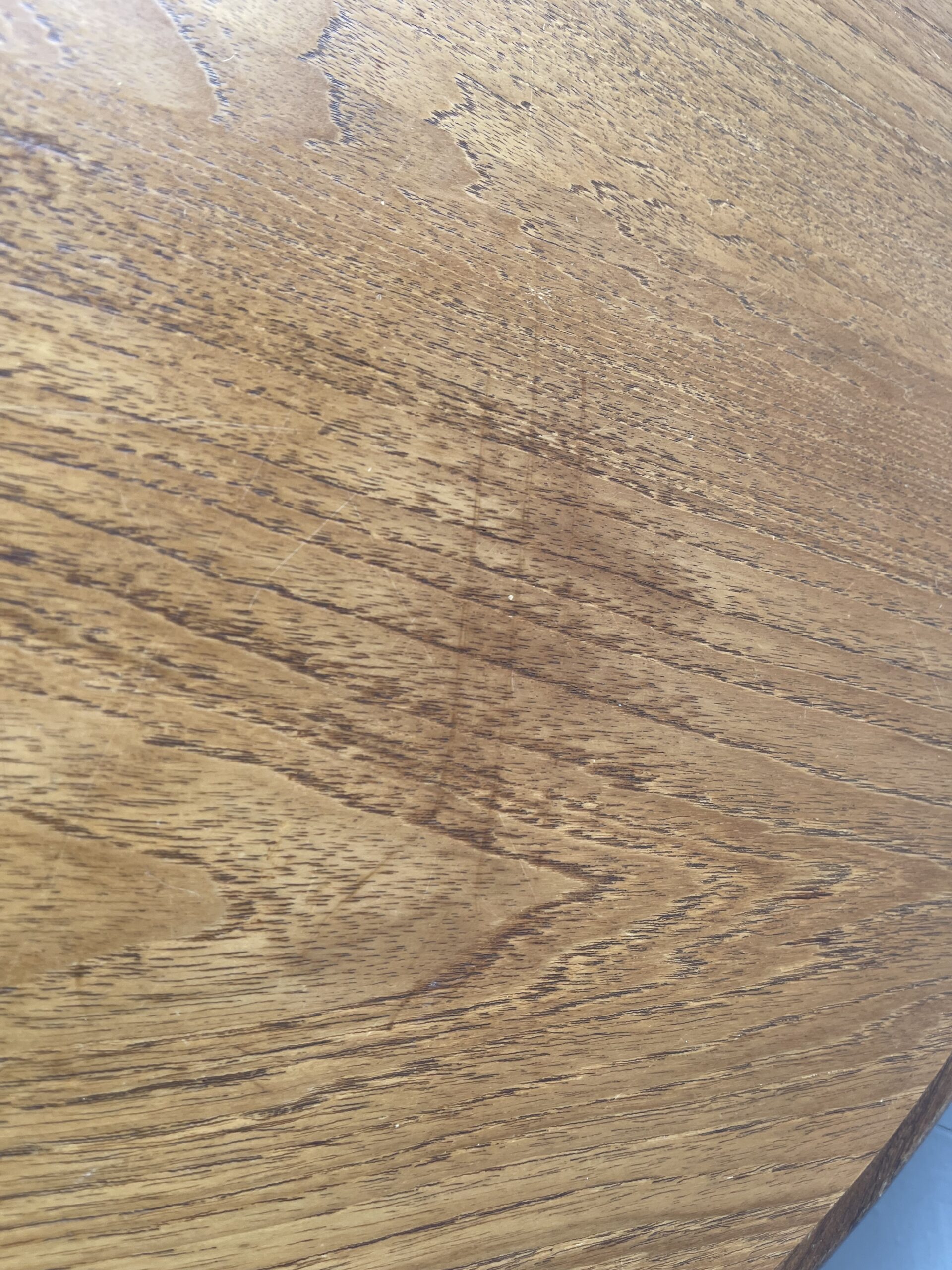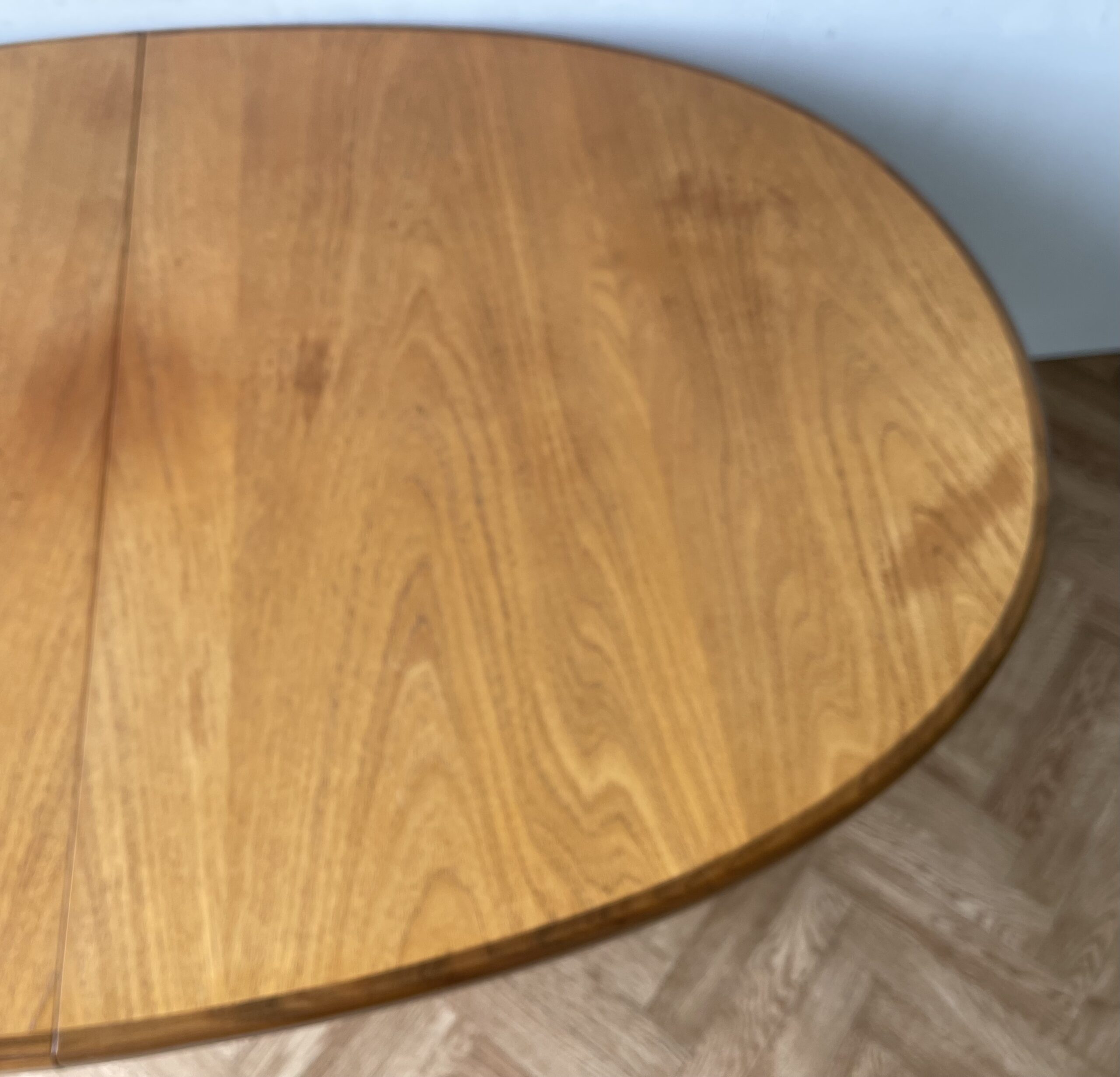 In used vintage condition, the table is structurally sound. There are some noticeable signs of wear, some surface scratches, marks, blemishes and scuffs, please see photos, these form part of the description. The extending leaf is a noticeably darker than the rest of the table.