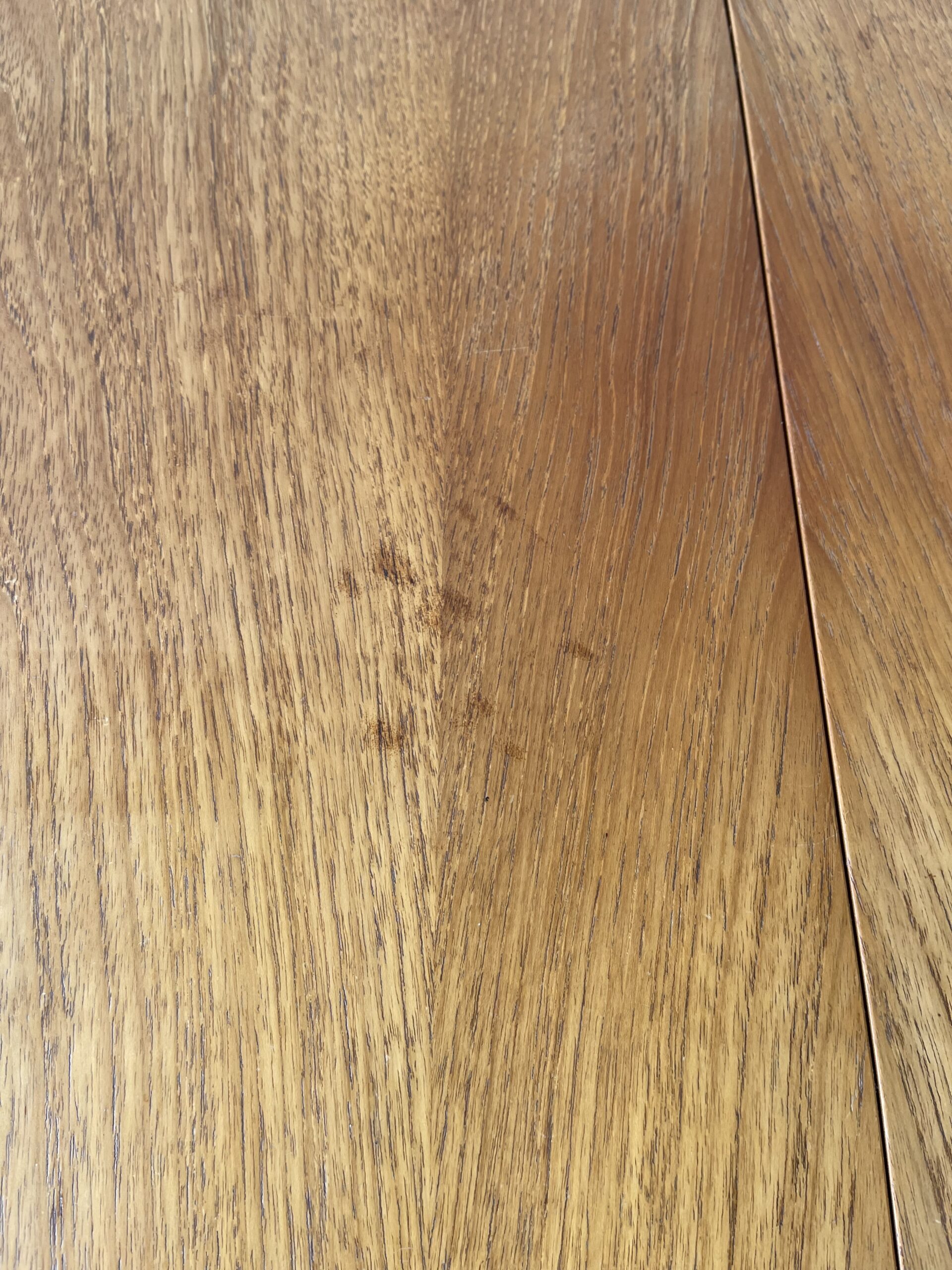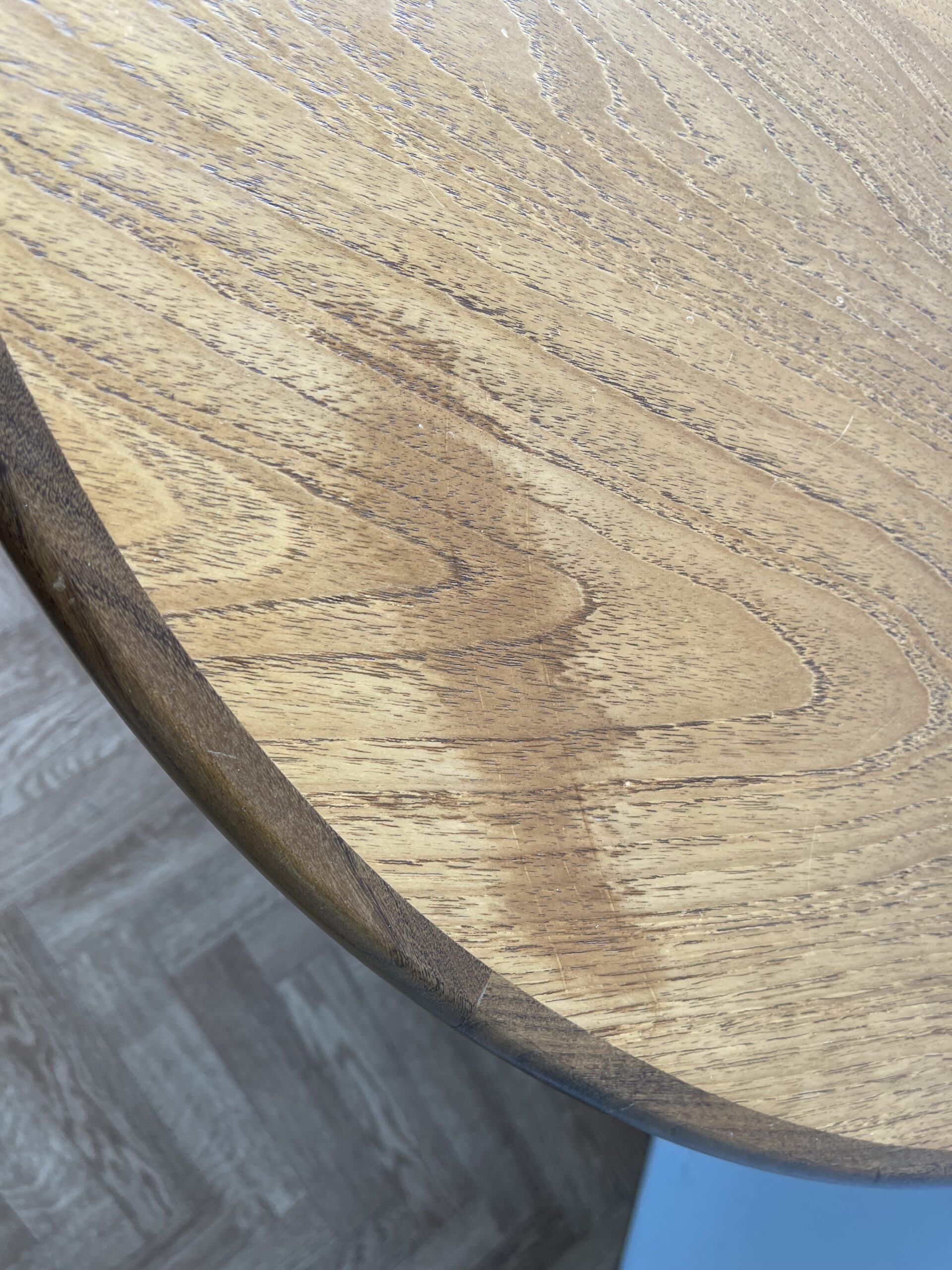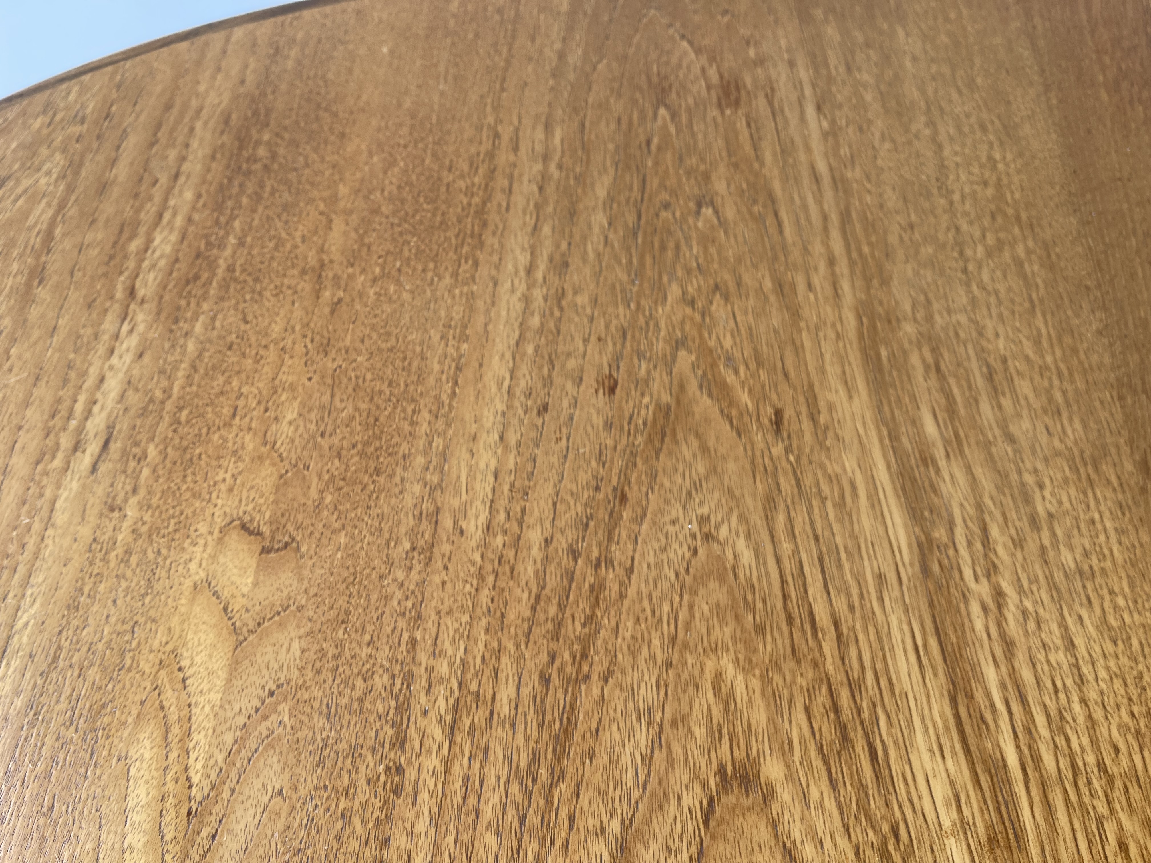In used vintage condition, the table is structurally sound. There are some noticeable signs of wear, some surface scratches, marks, blemishes and scuffs, please see photos, these form part of the description. The extending leaf is a noticeably darker than the rest of the table.