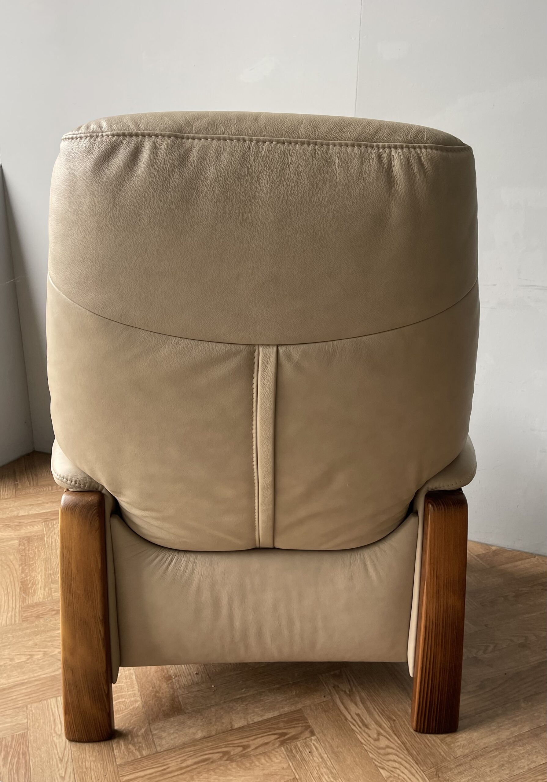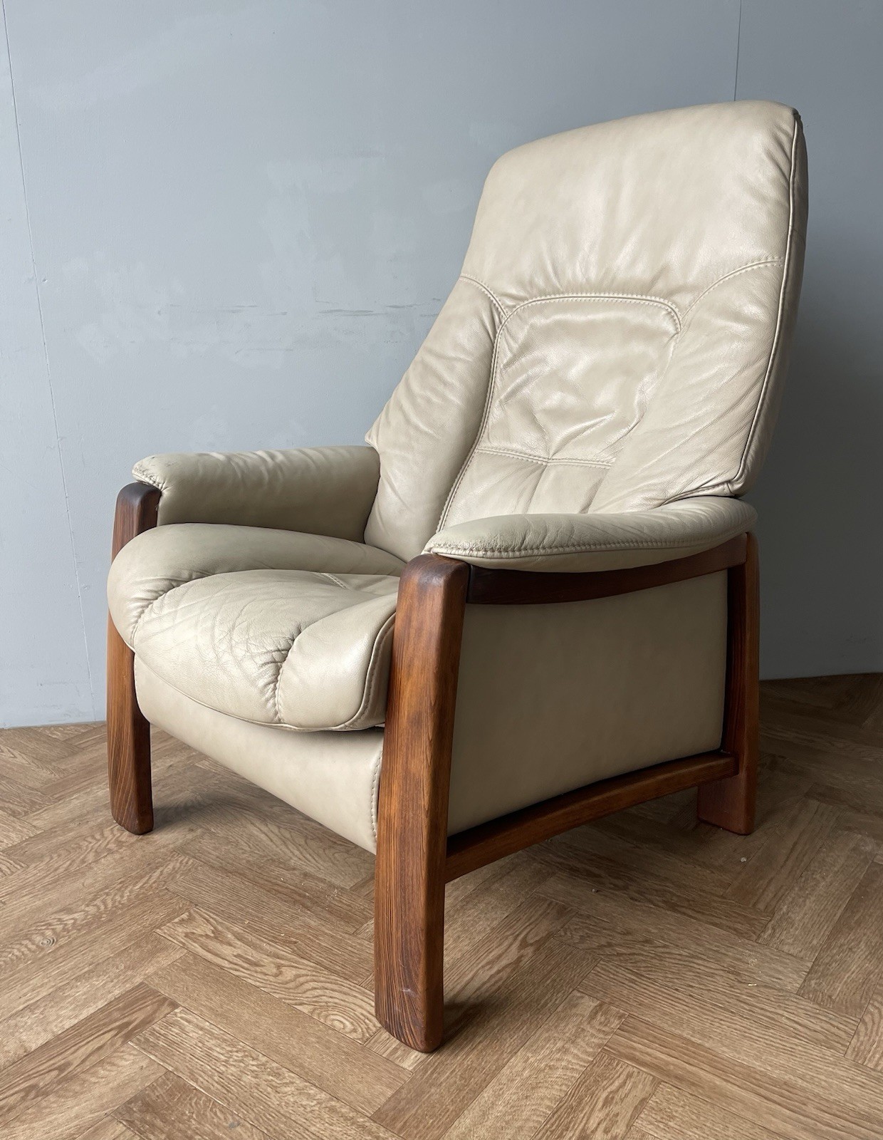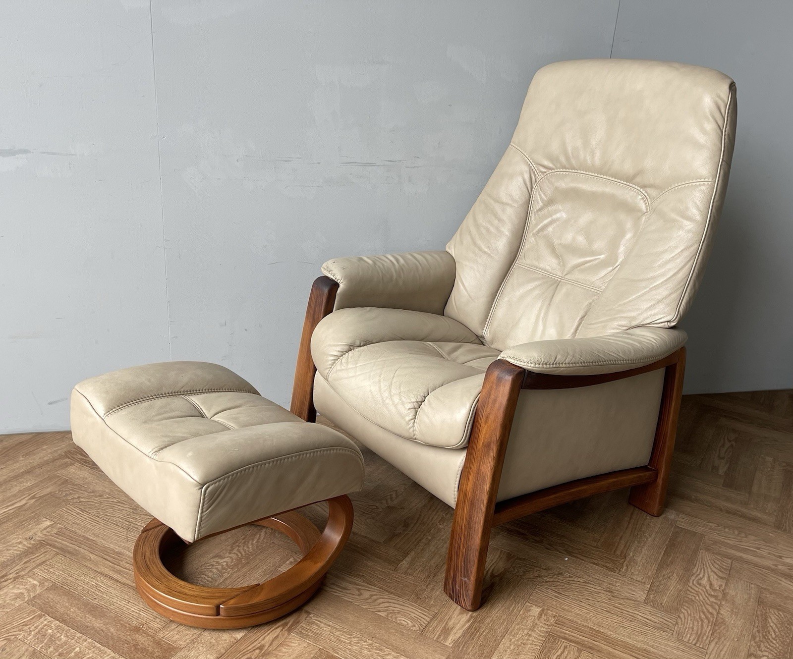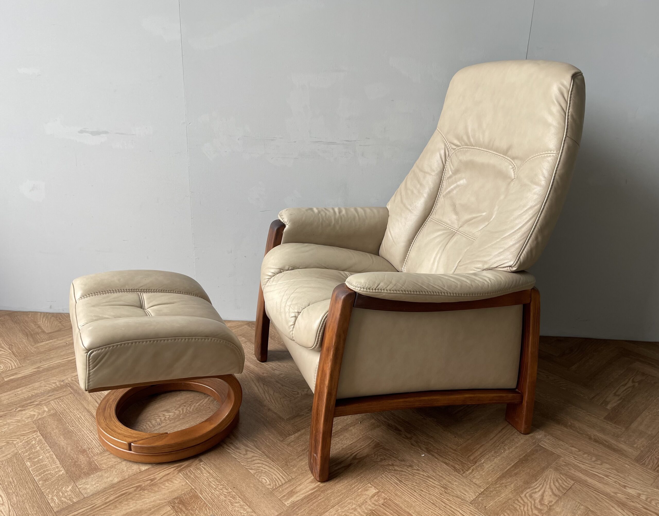 Himolla Thesme leather and wooden reclining armchair with footstool. Incredibly comfortable chair. Cost over £2000 new.