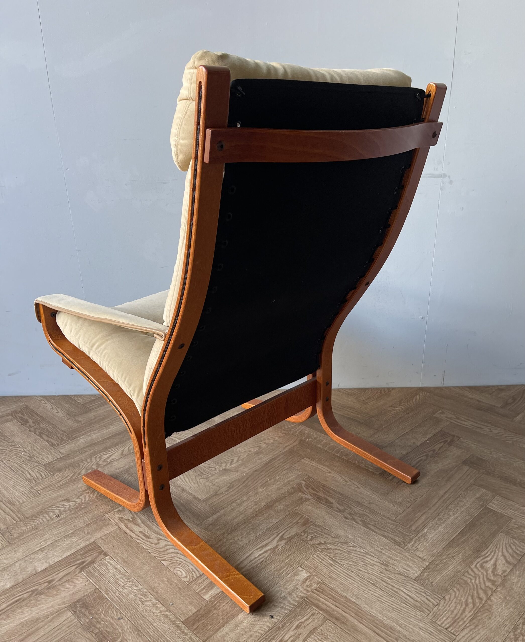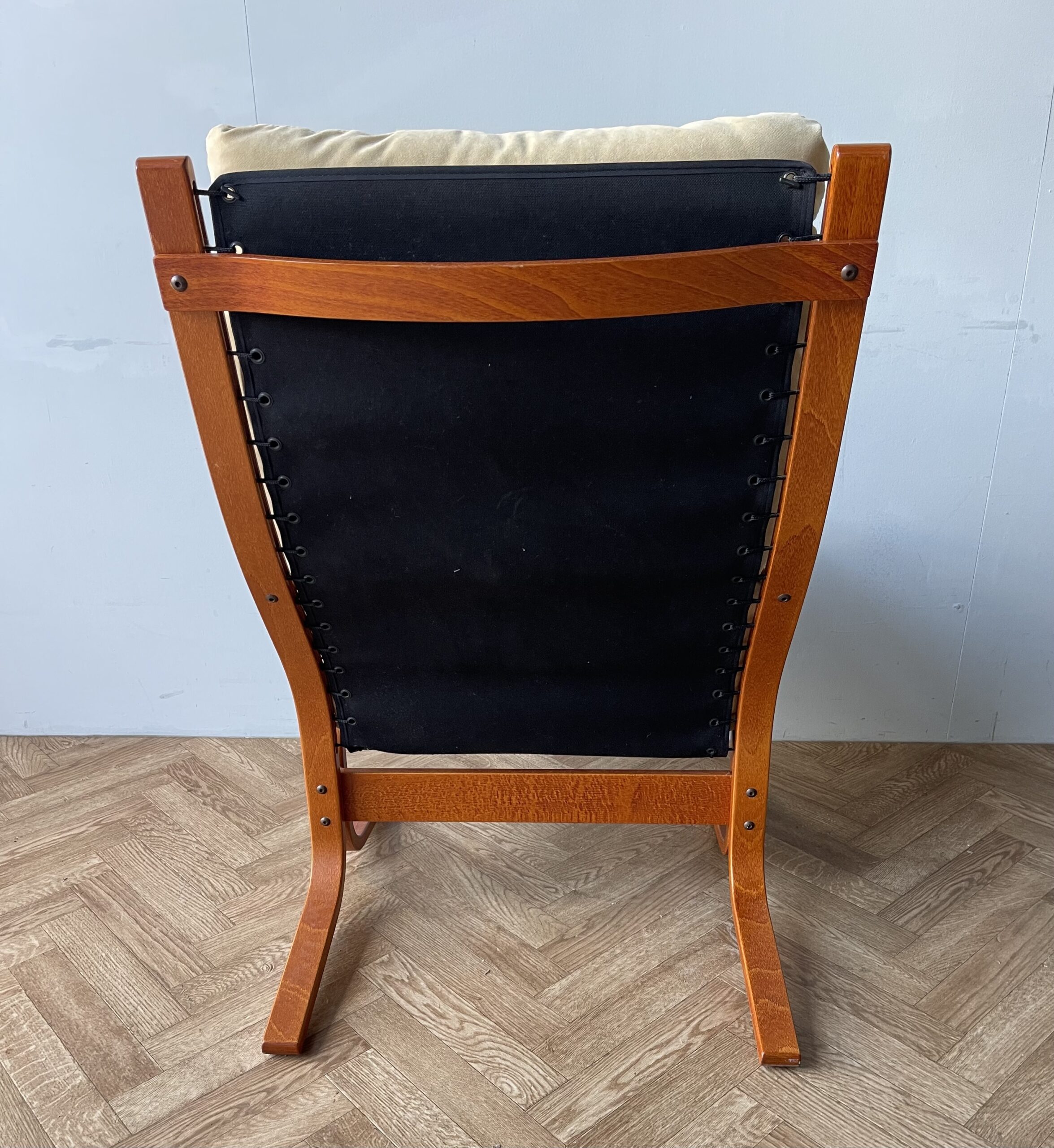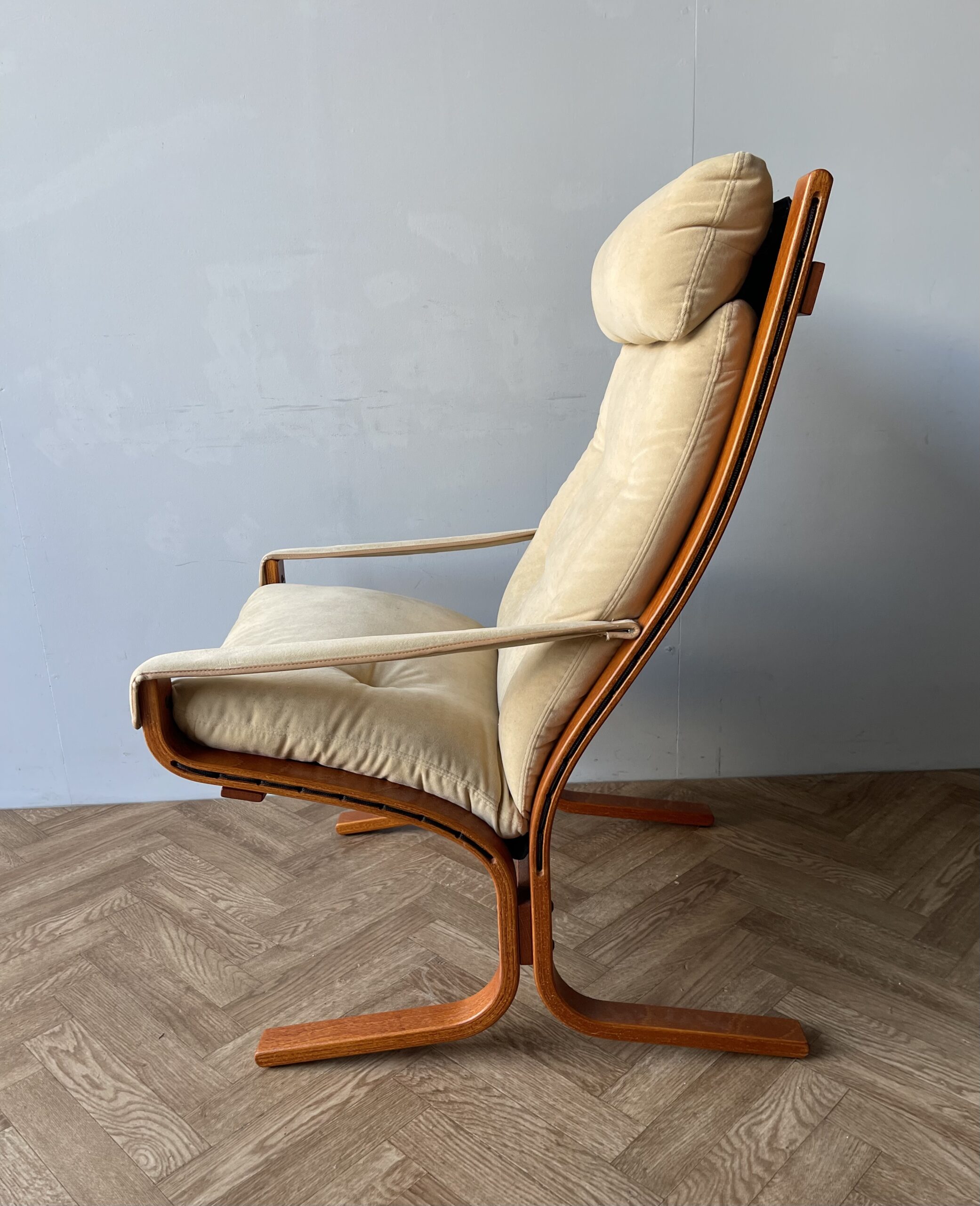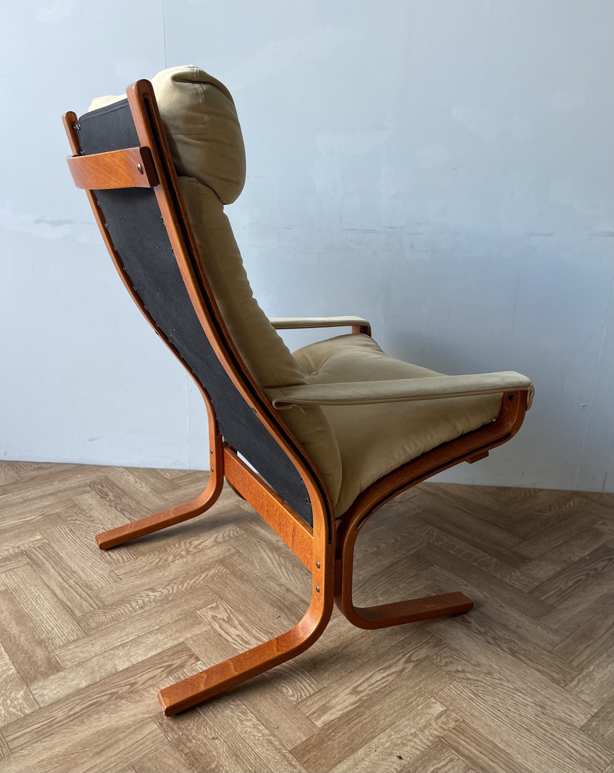 This is a stunning “Siesta” armchair with beech frame and a high back, with gorgeously curved frame. Upholstered in original canvas lining and beige leather/suede pad cushions/armrests.