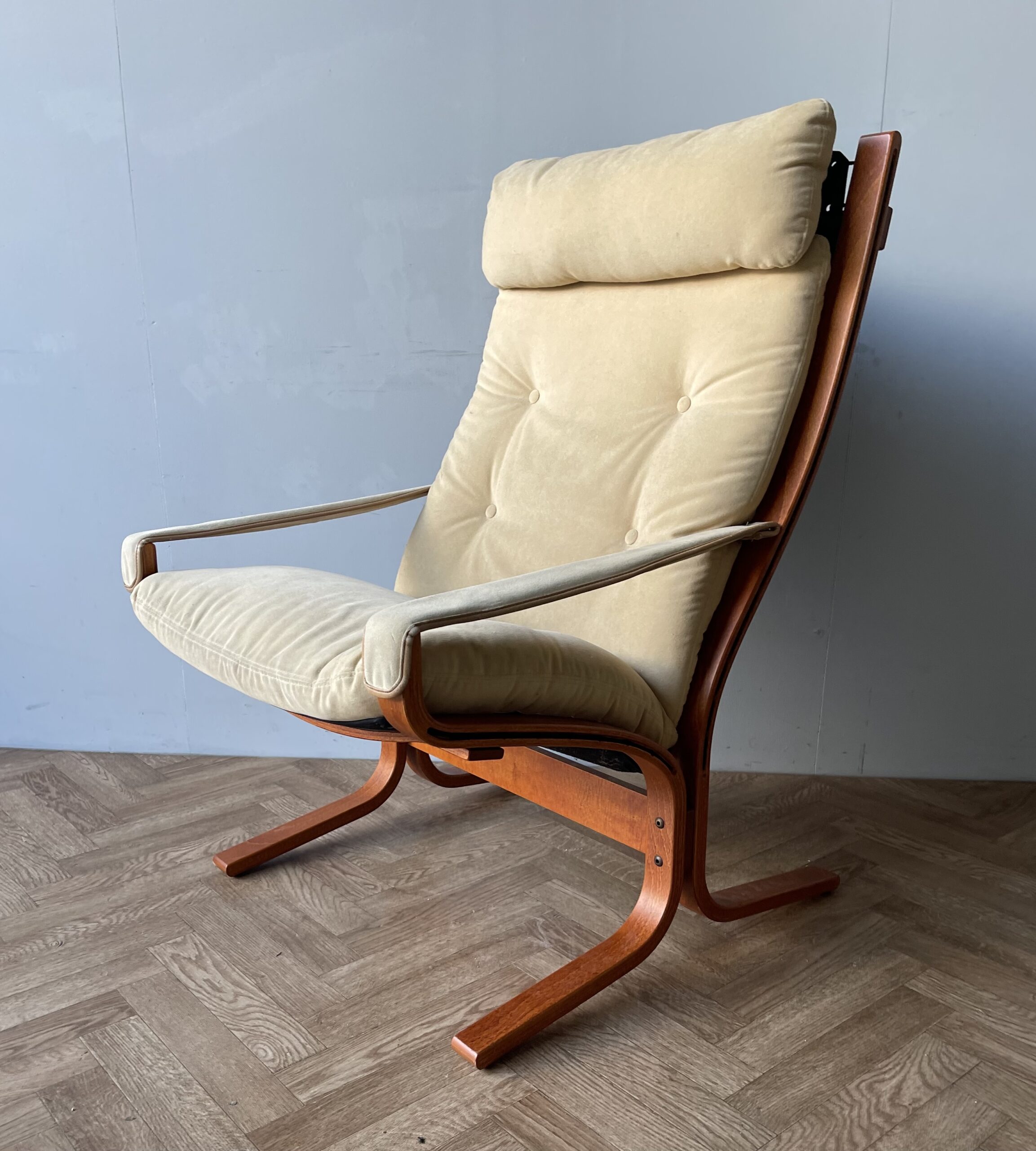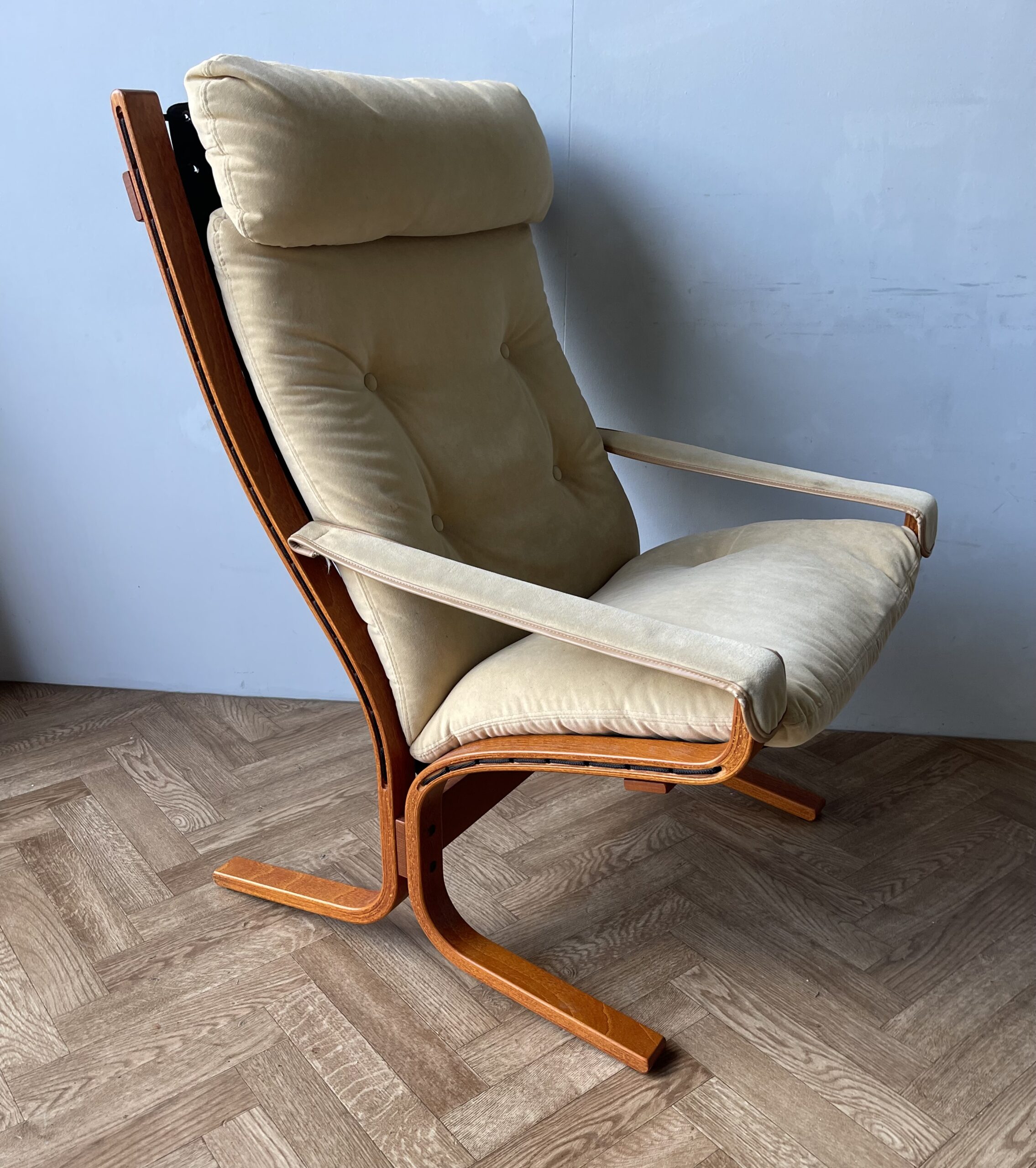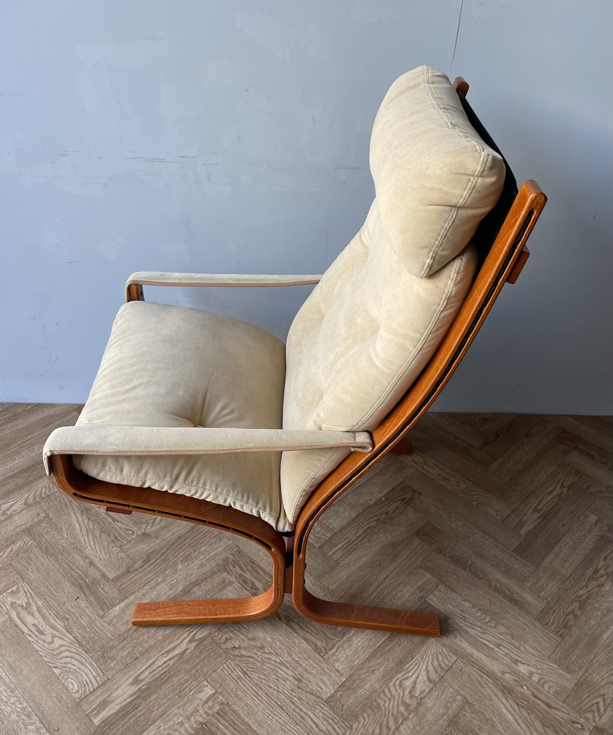 This is a stunning “Siesta” armchair with beech frame and a high back, with gorgeously curved frame. Upholstered in original canvas lining and beige leather/suede pad cushions/armrests.