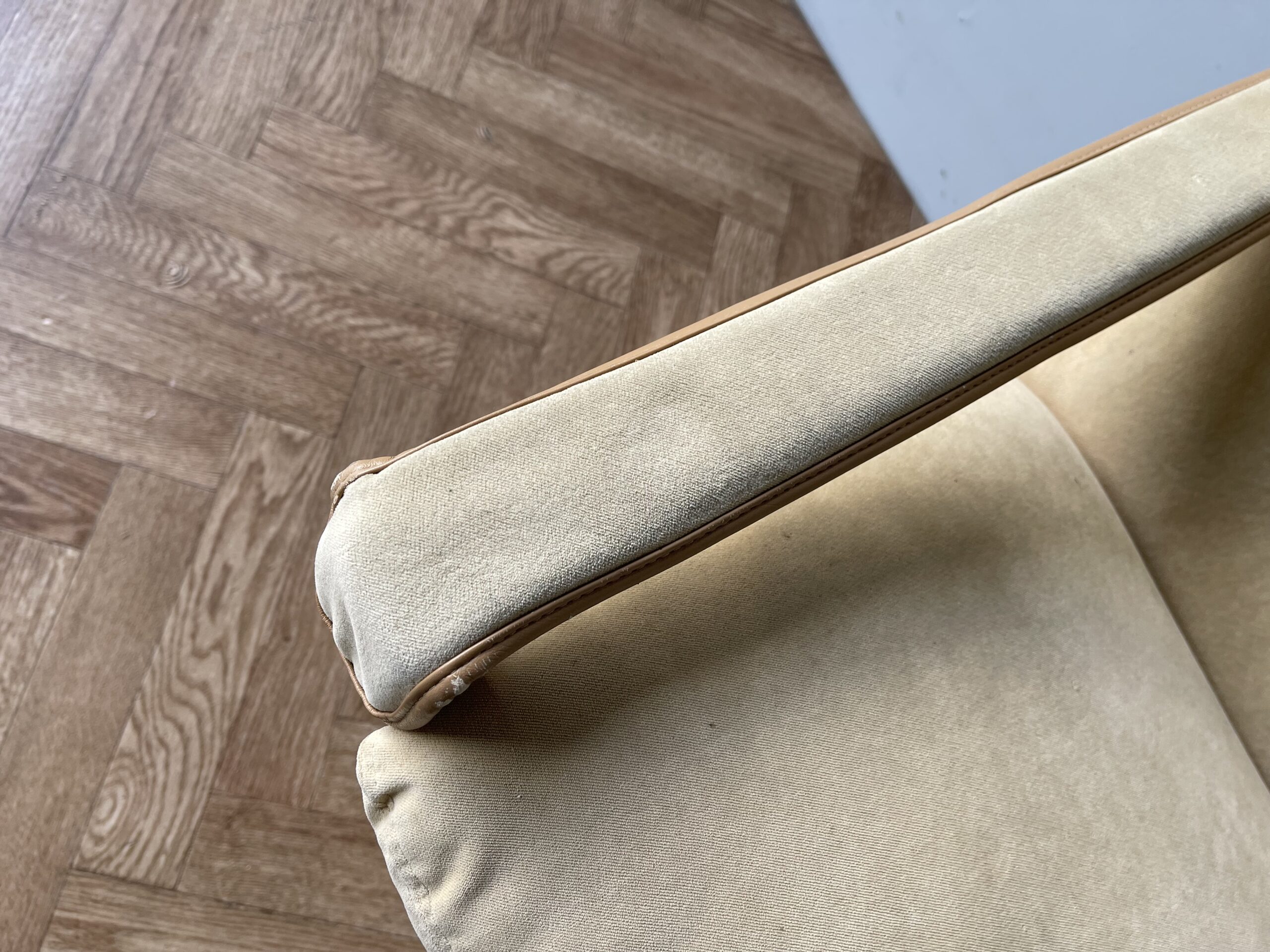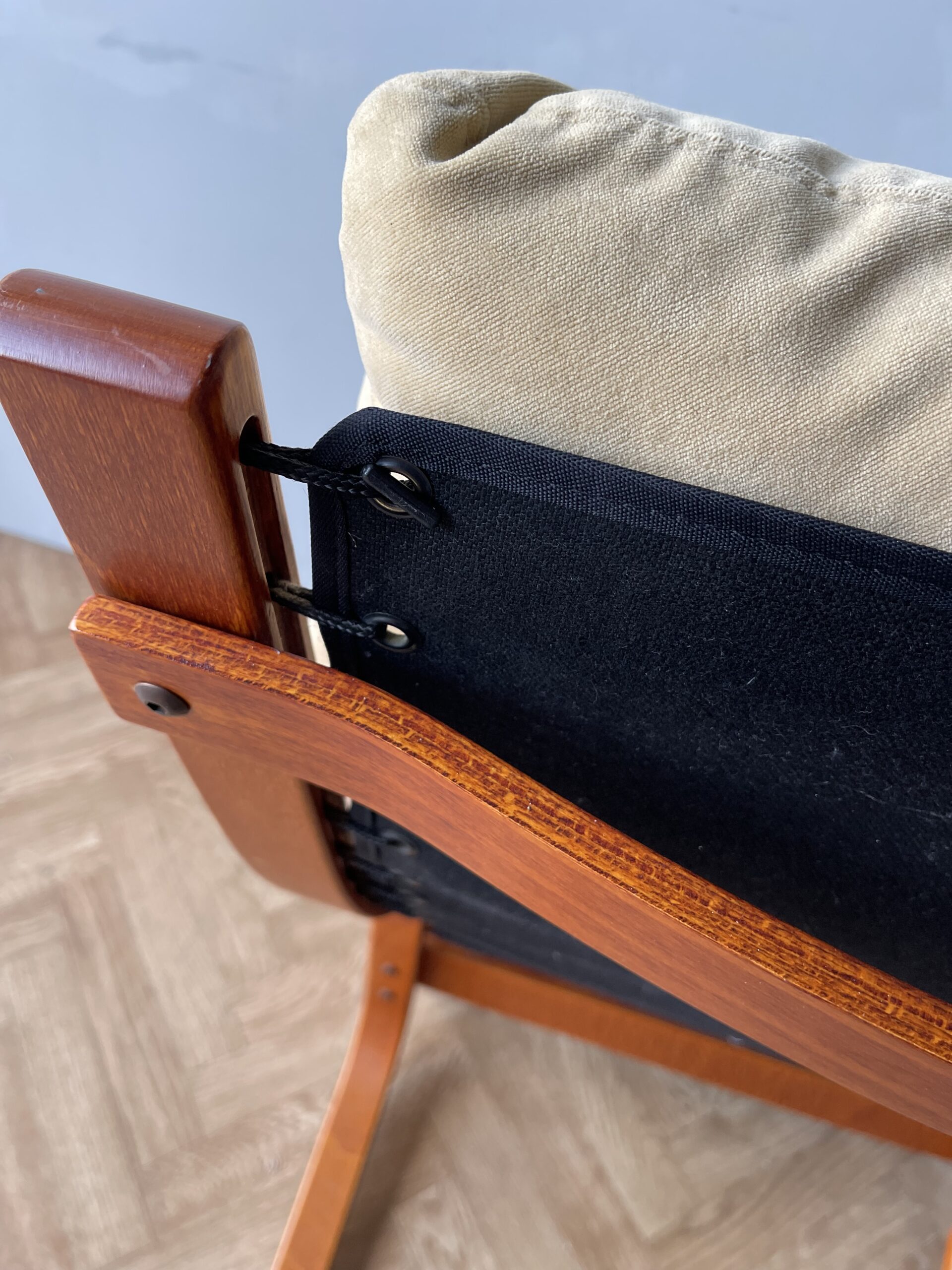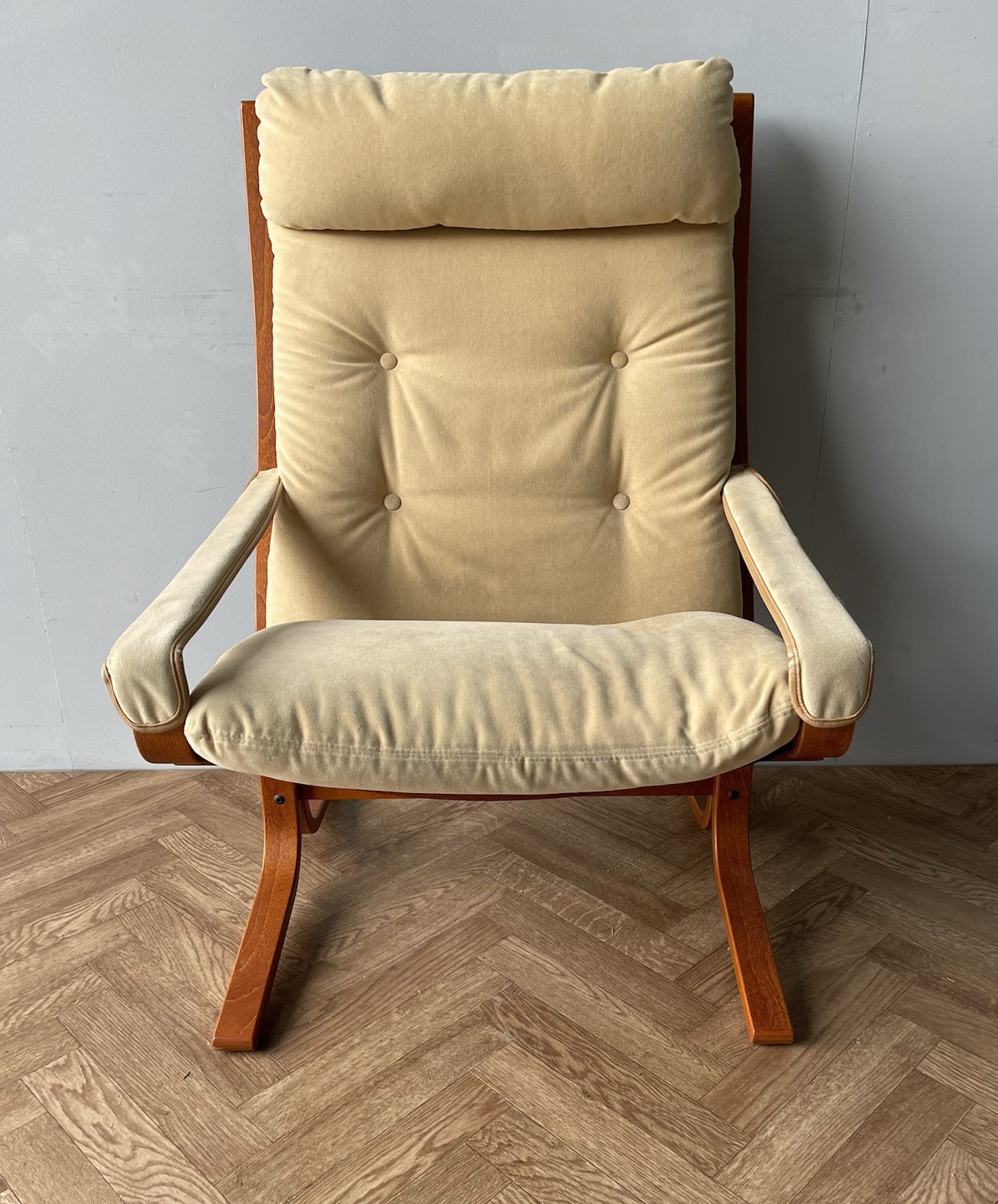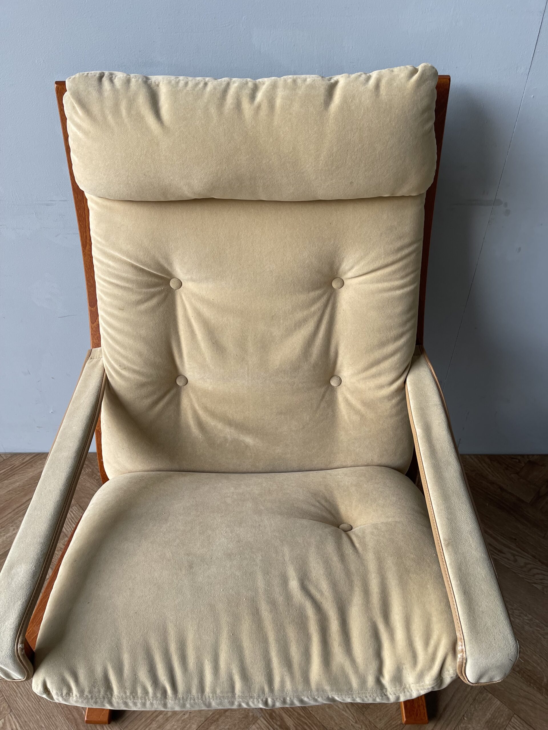 This is a stunning “Siesta” armchair with beech frame and a high back, with gorgeously curved frame. Upholstered in original canvas lining and beige leather/suede pad cushions/armrests.