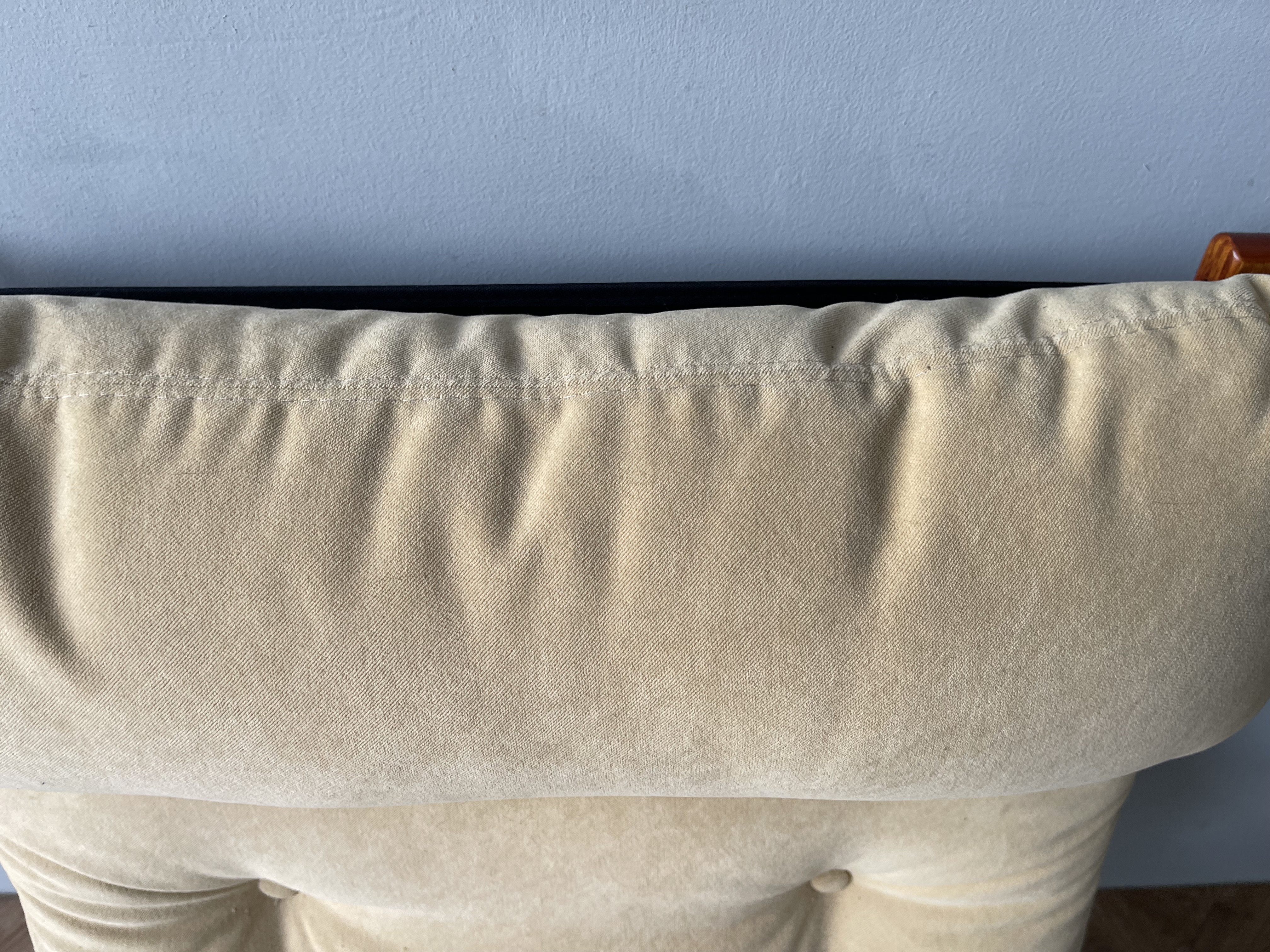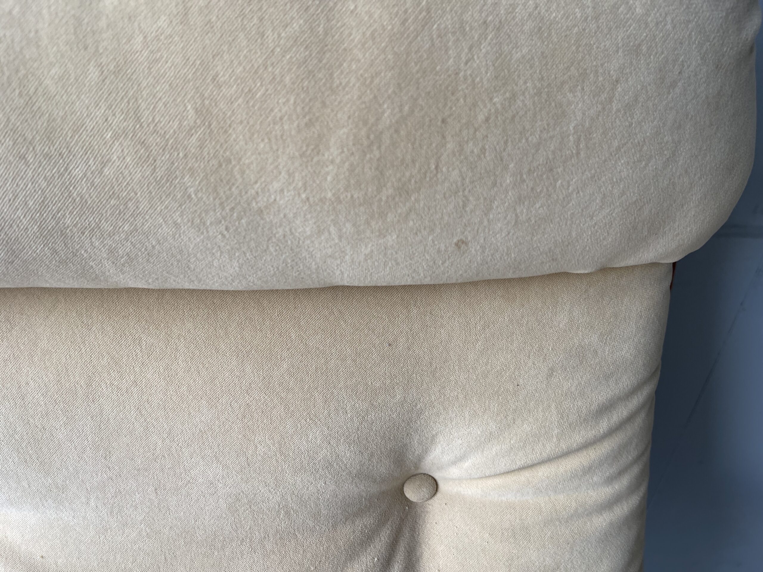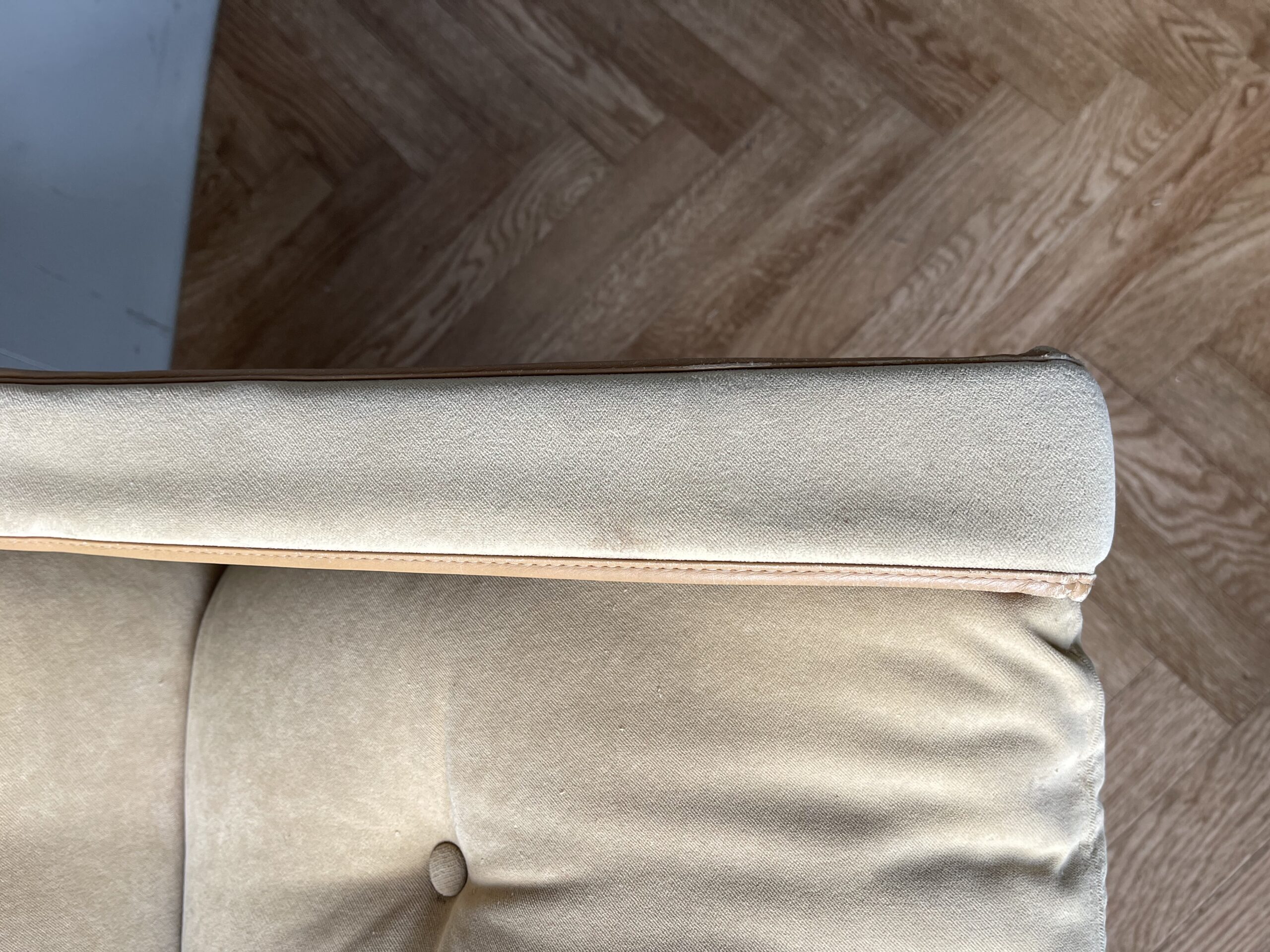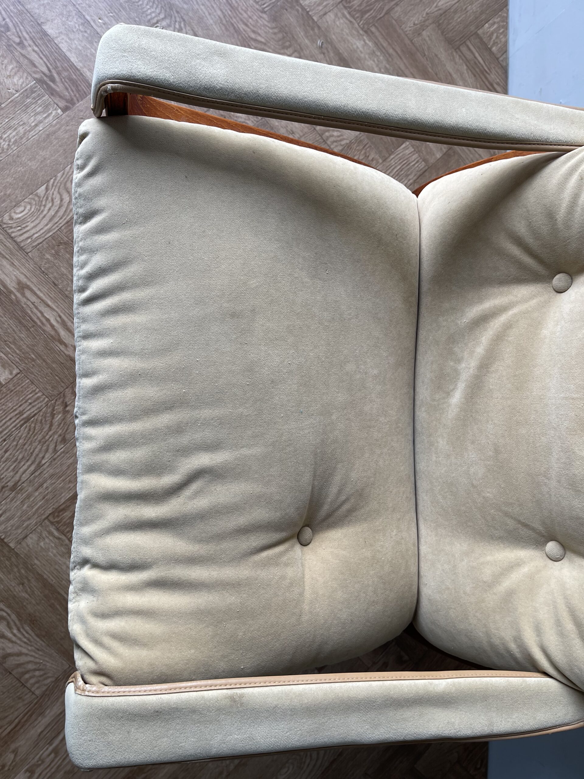 In good used vintage condition, the chair is structurally sound. The upholstery is fair condition and has some signs of wear, and there is some pilling to the seat pad. The frame has some minor signs of wear, some scuffs and marks. There is a decorative button missing. Overall in general good vintage condition. Please see photos, these form part of the description.