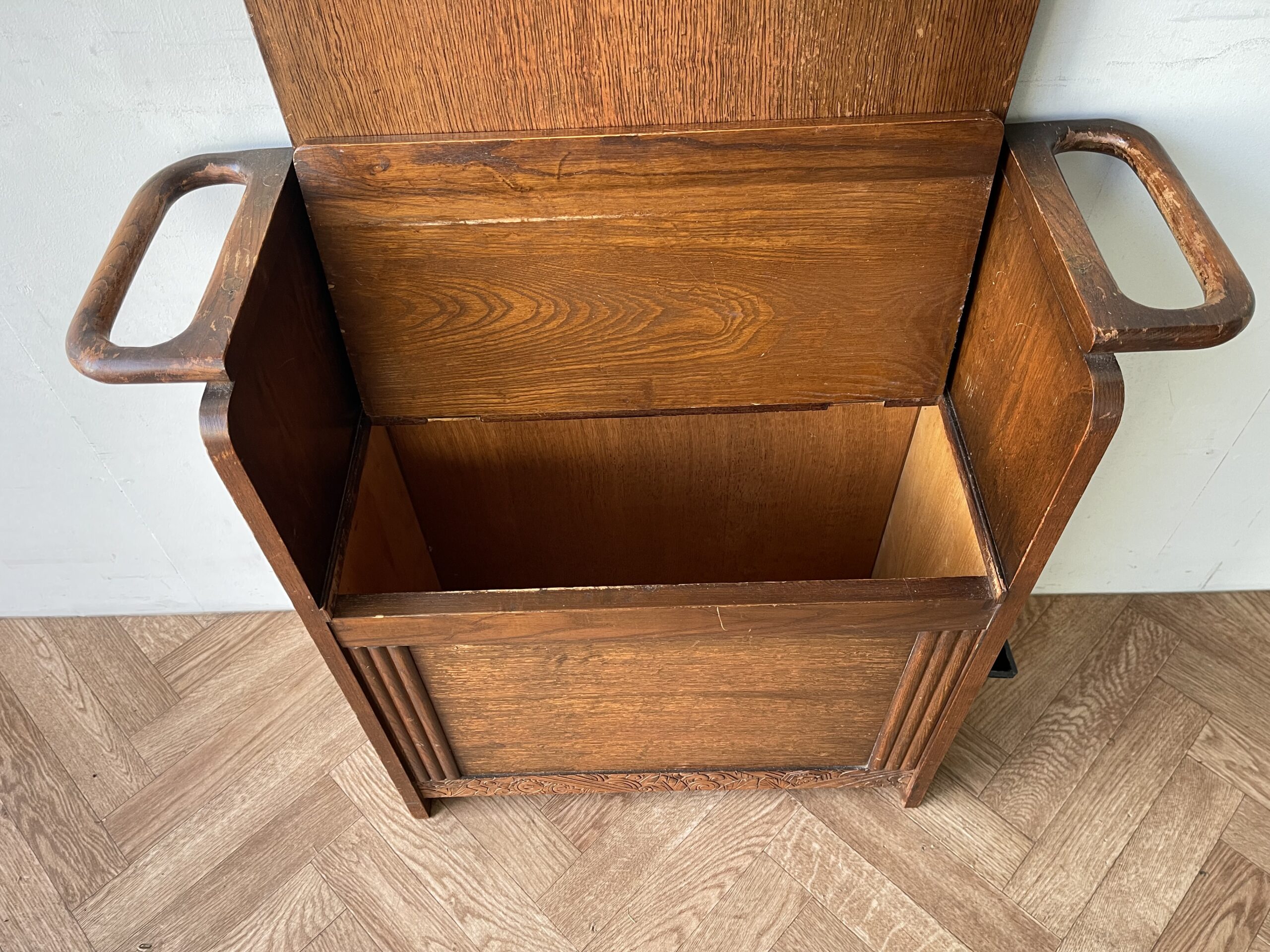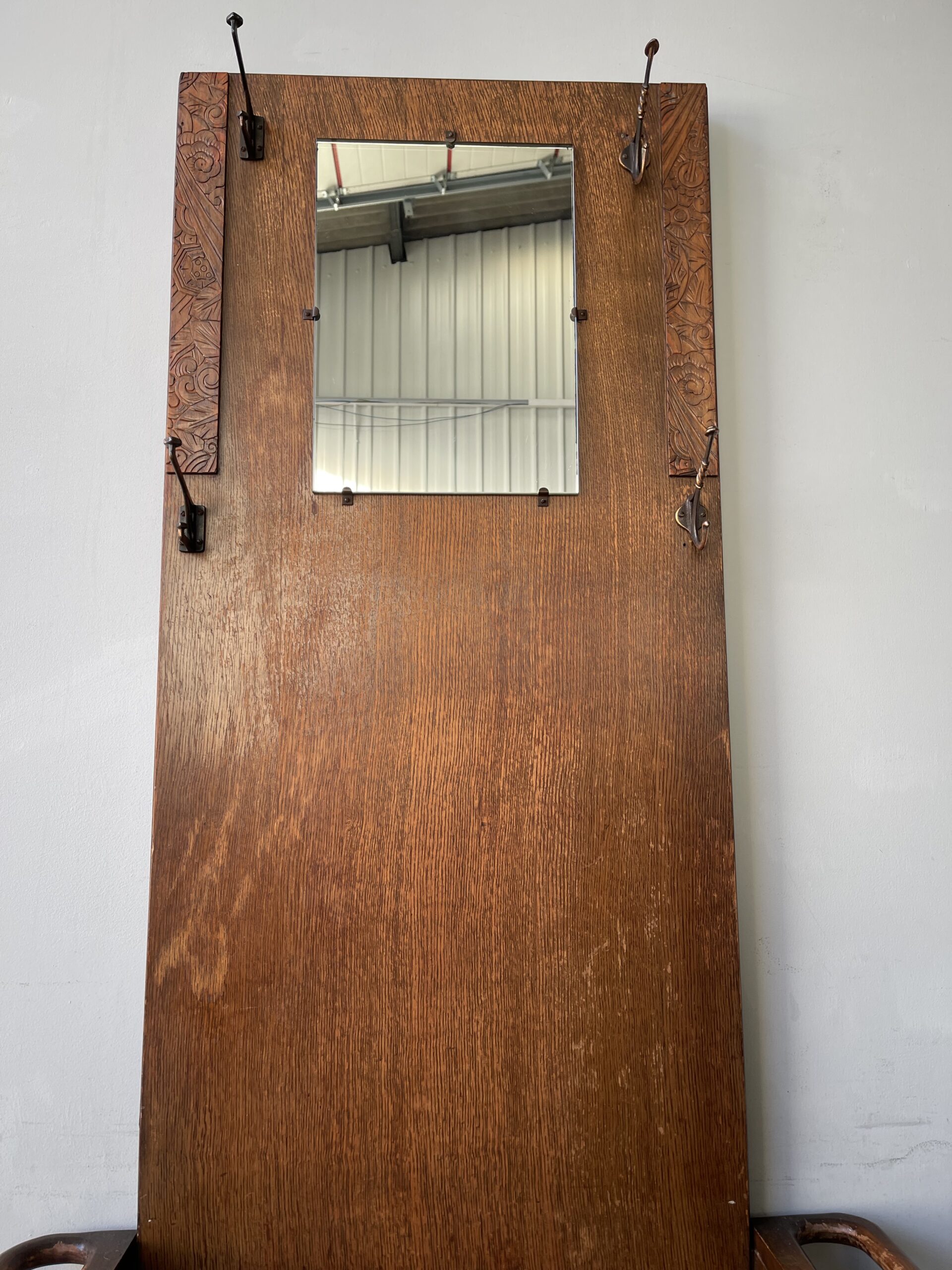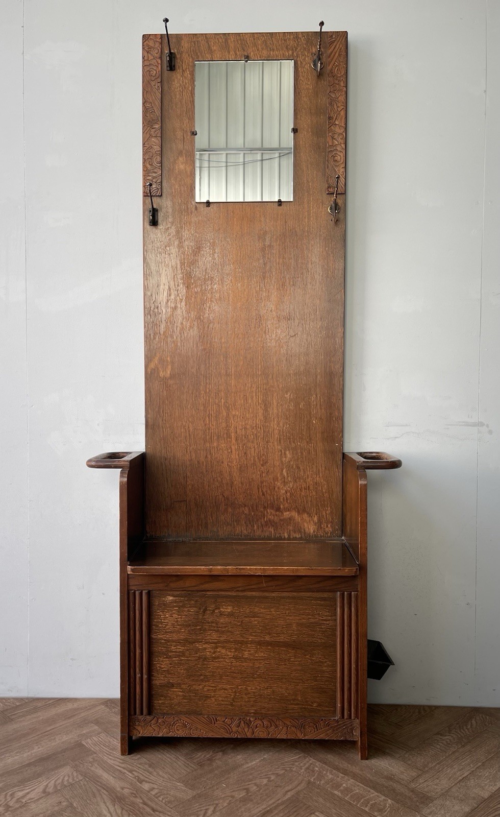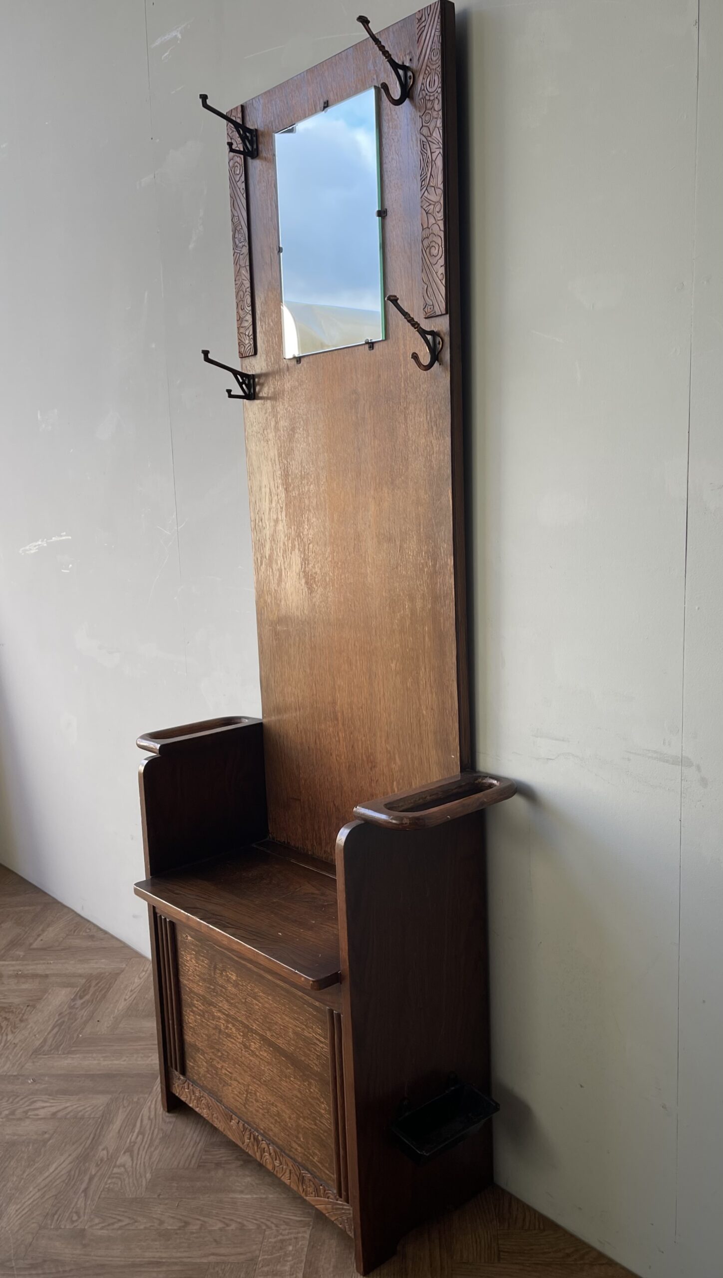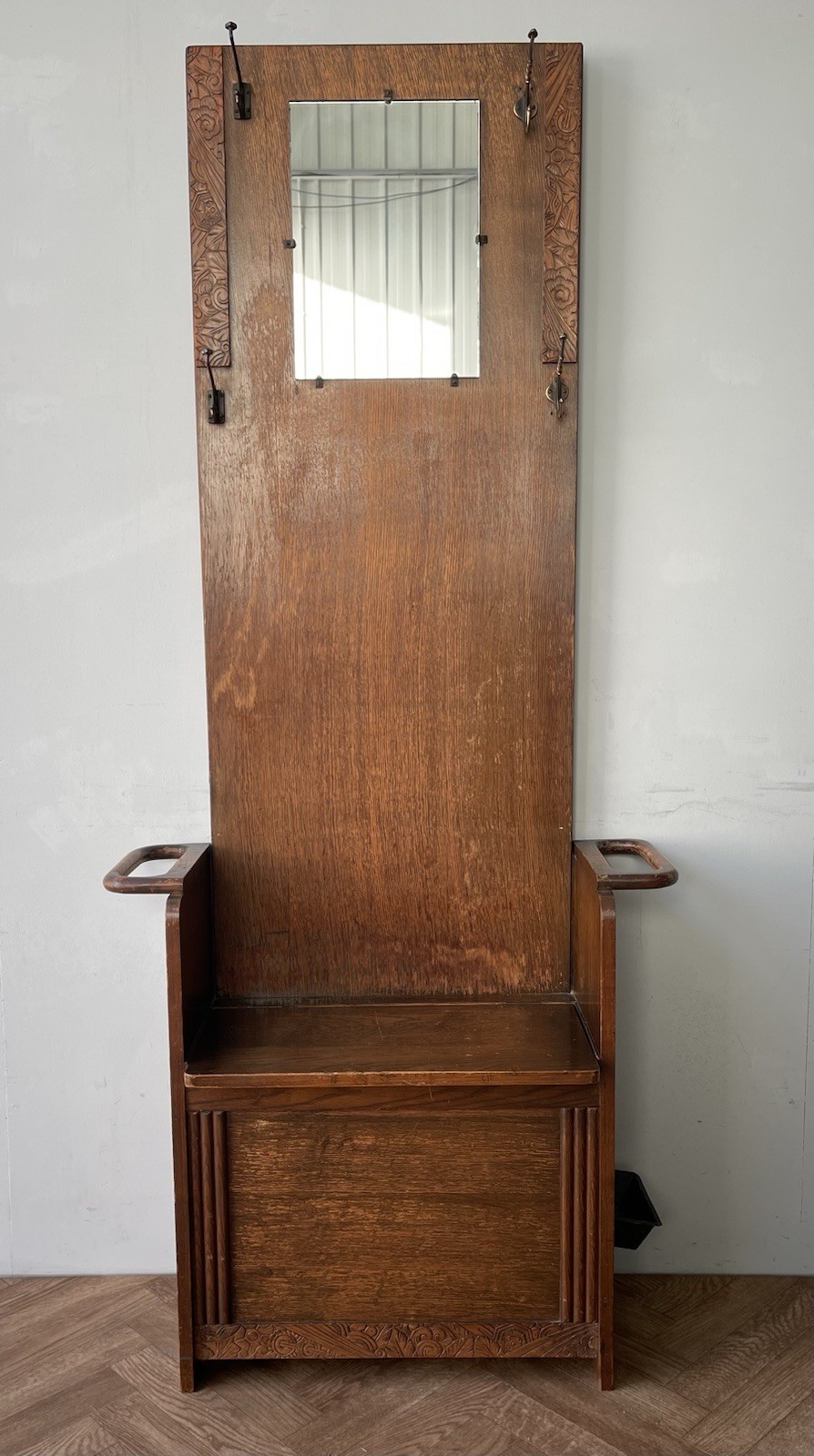 This is an antique oak hall stand, also known as a hall tree or hall bench. This specific piece appears to be an Art Deco style item from the early 20th century.