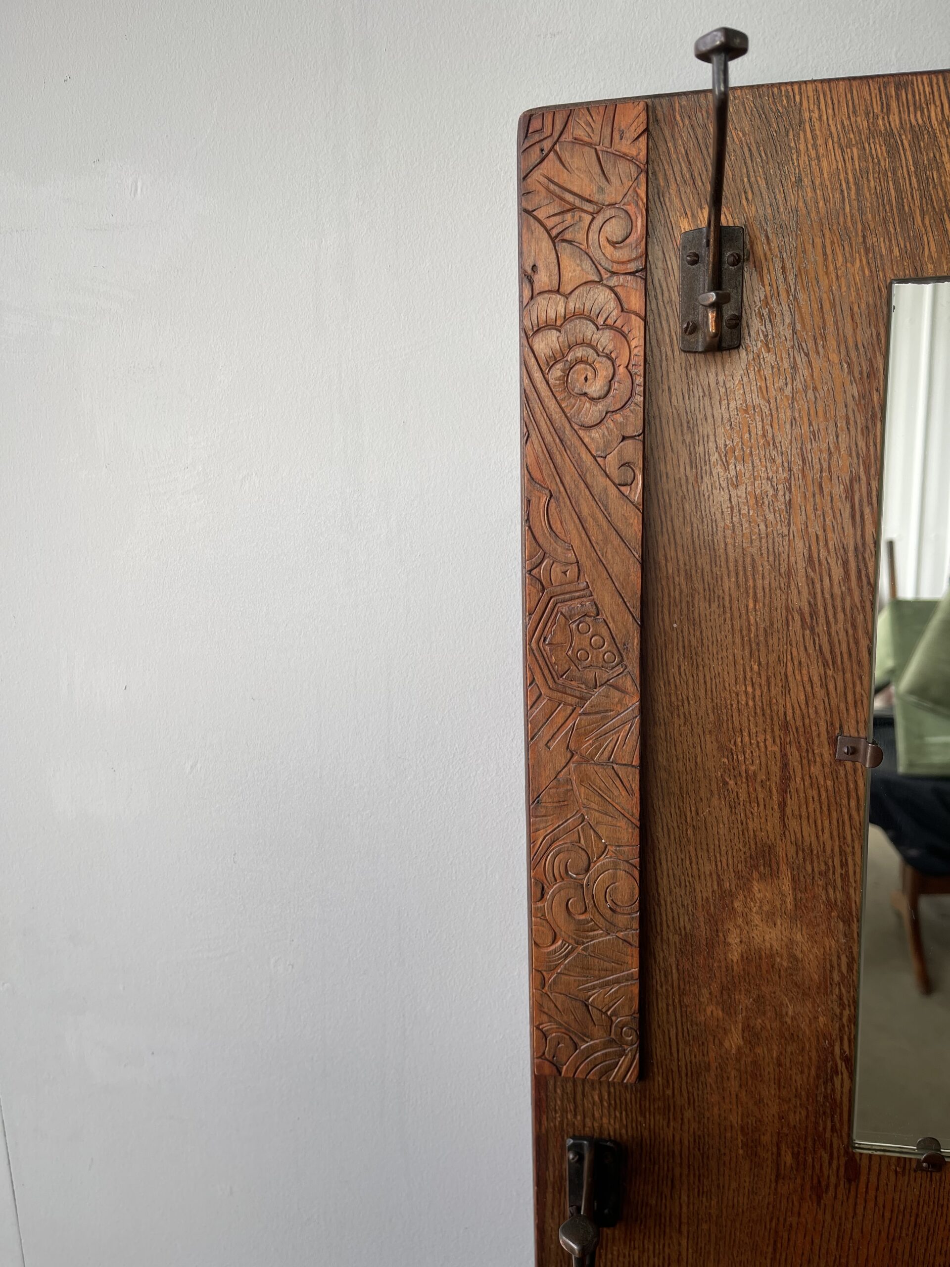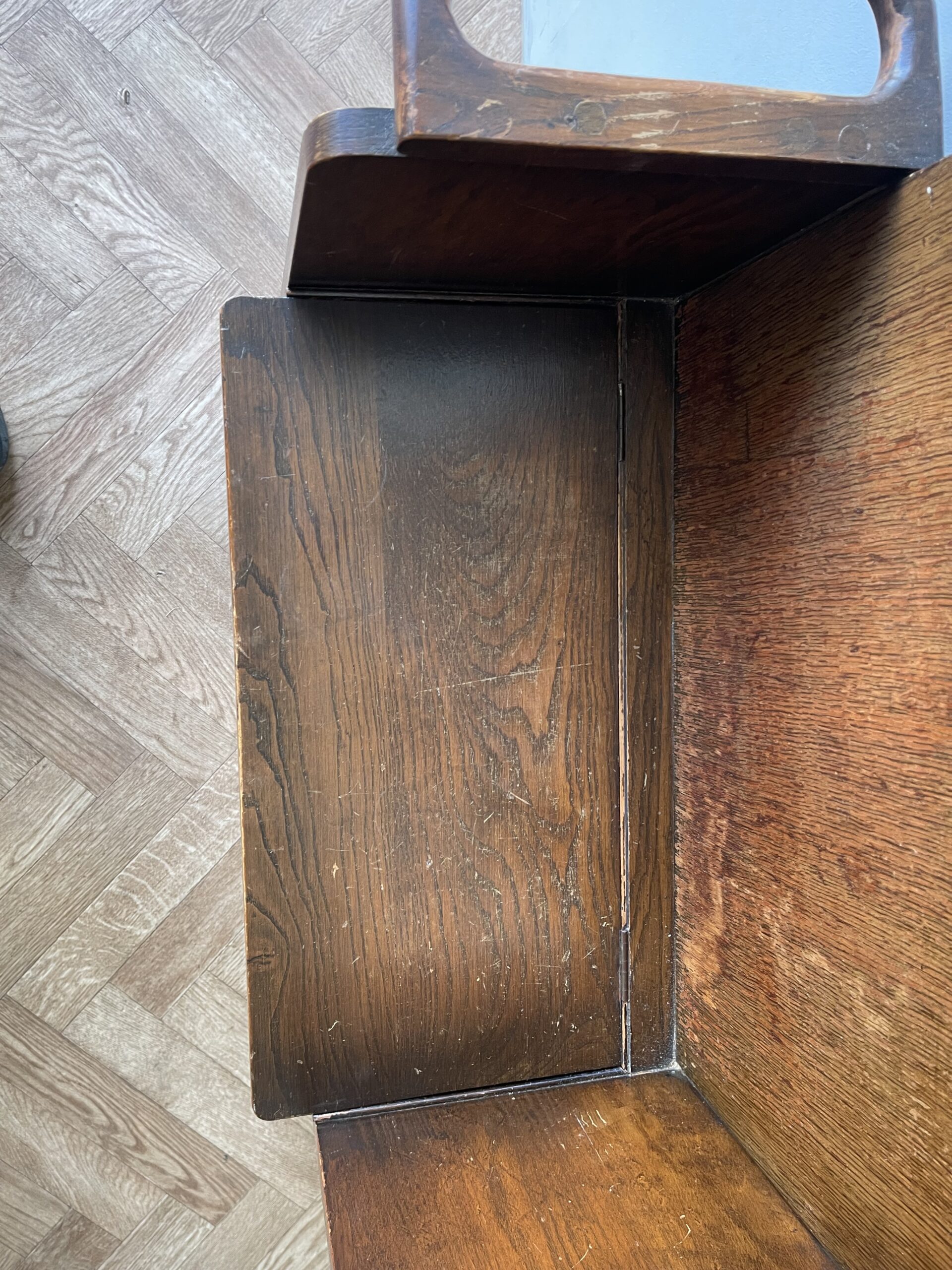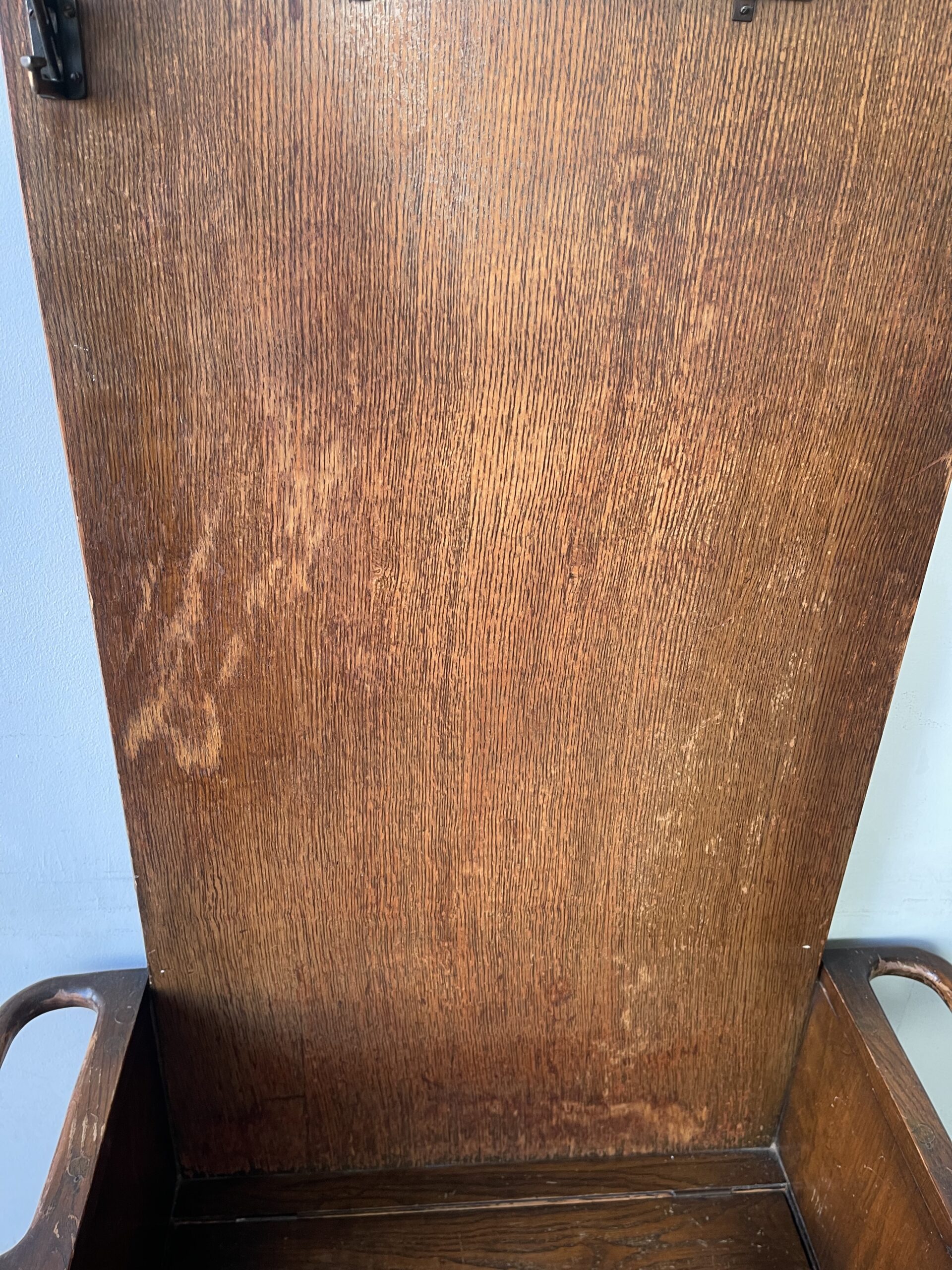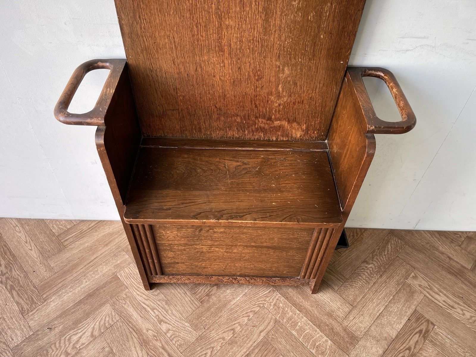 This is an antique oak hall stand, also known as a hall tree or hall bench. This specific piece appears to be an Art Deco style item from the early 20th century.