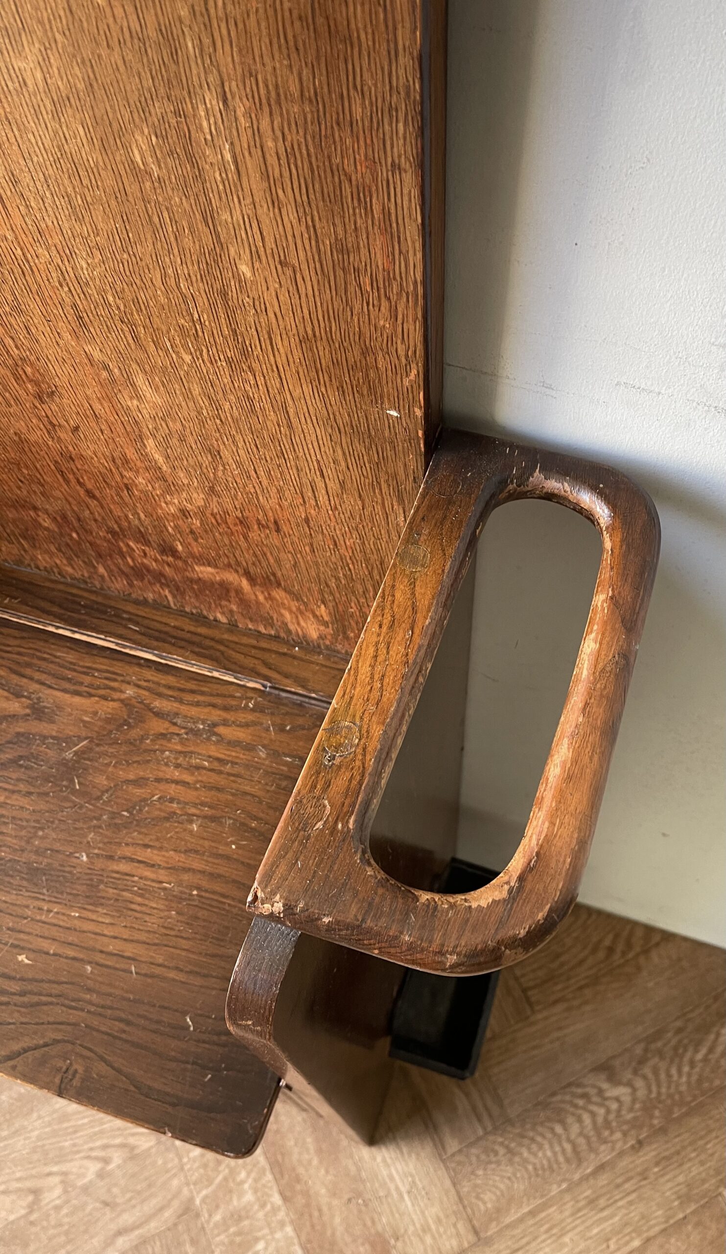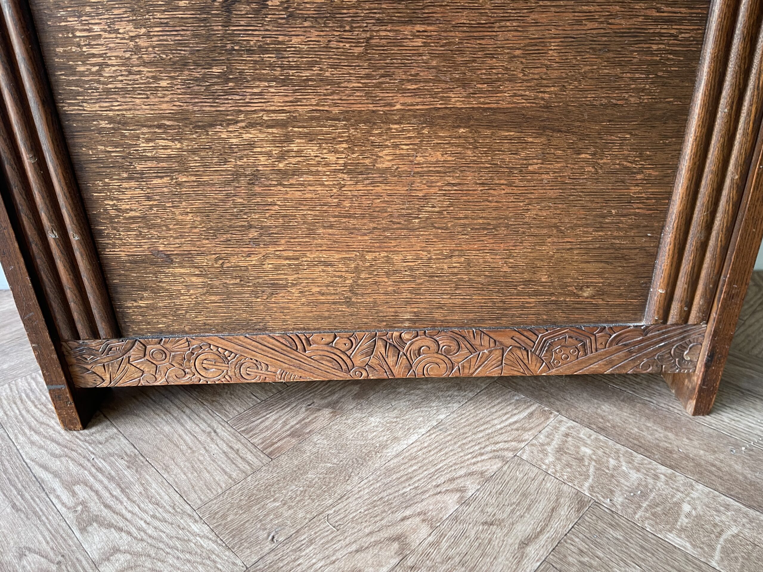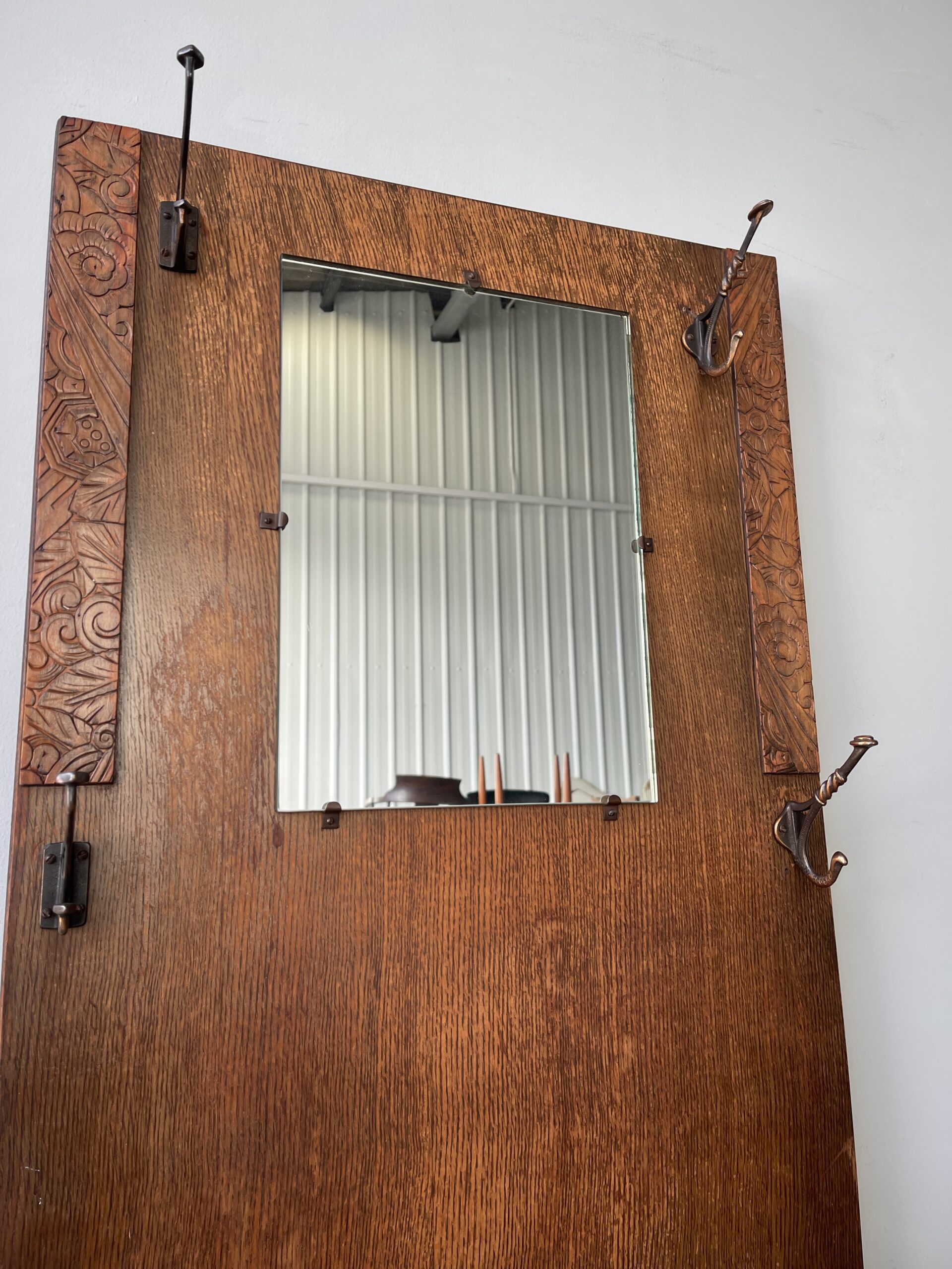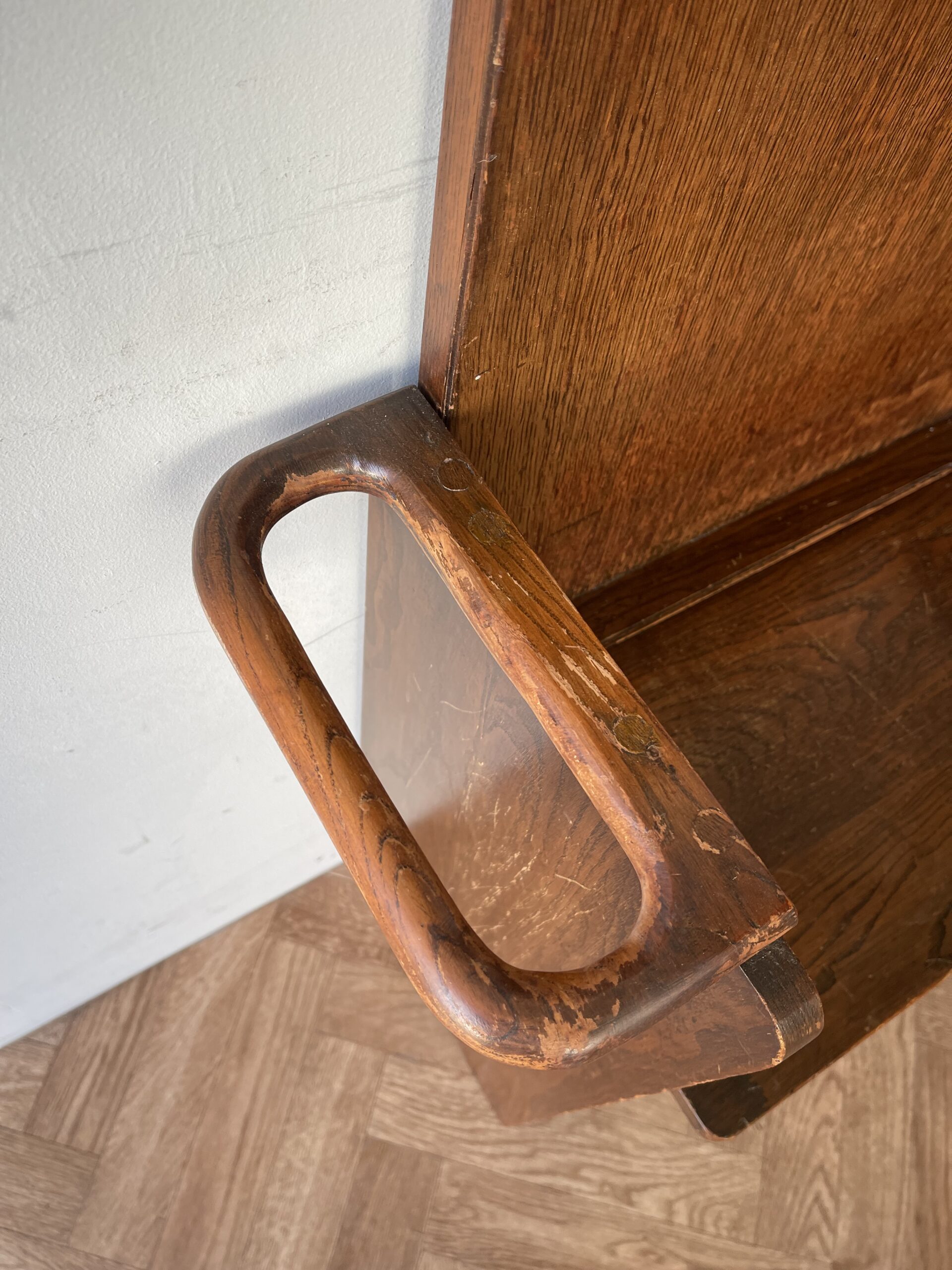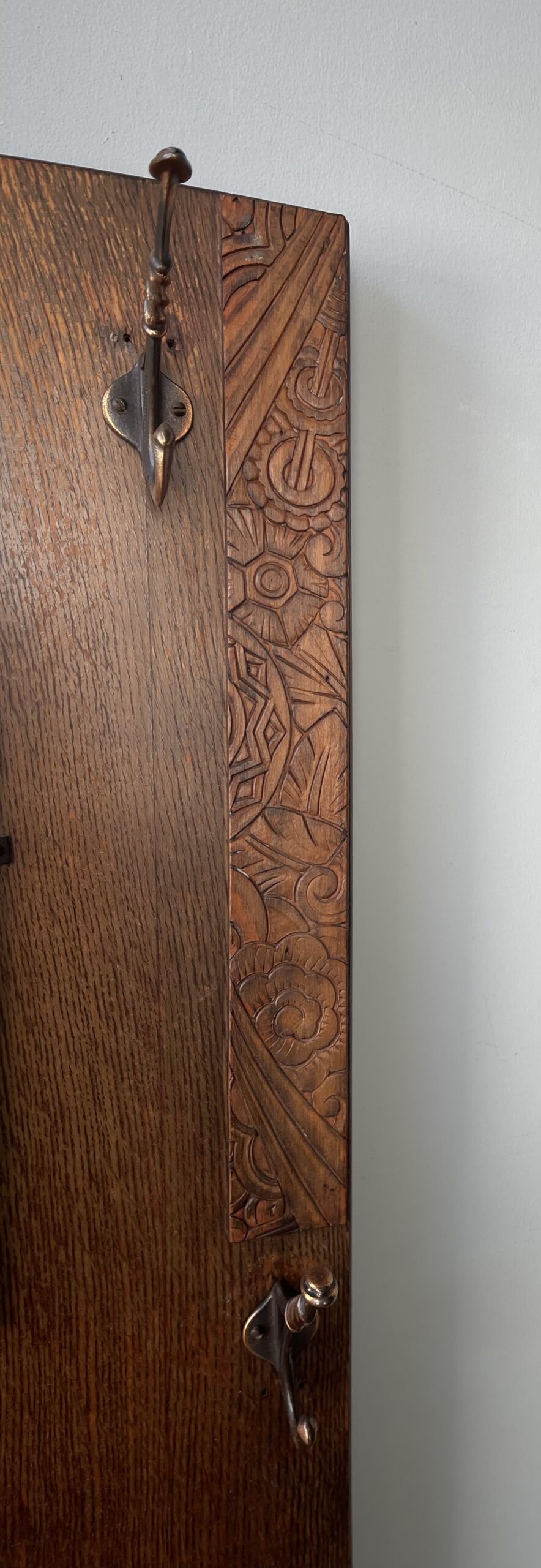 This is an antique oak hall stand, also known as a hall tree or hall bench. This specific piece appears to be an Art Deco style item from the early 20th century.