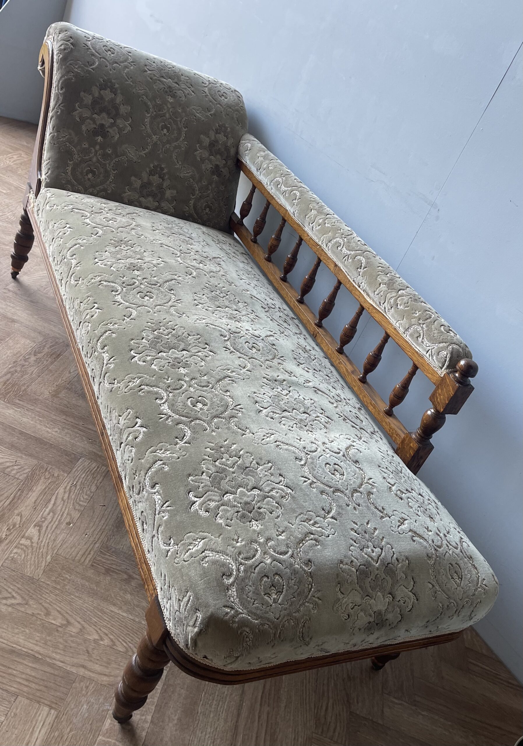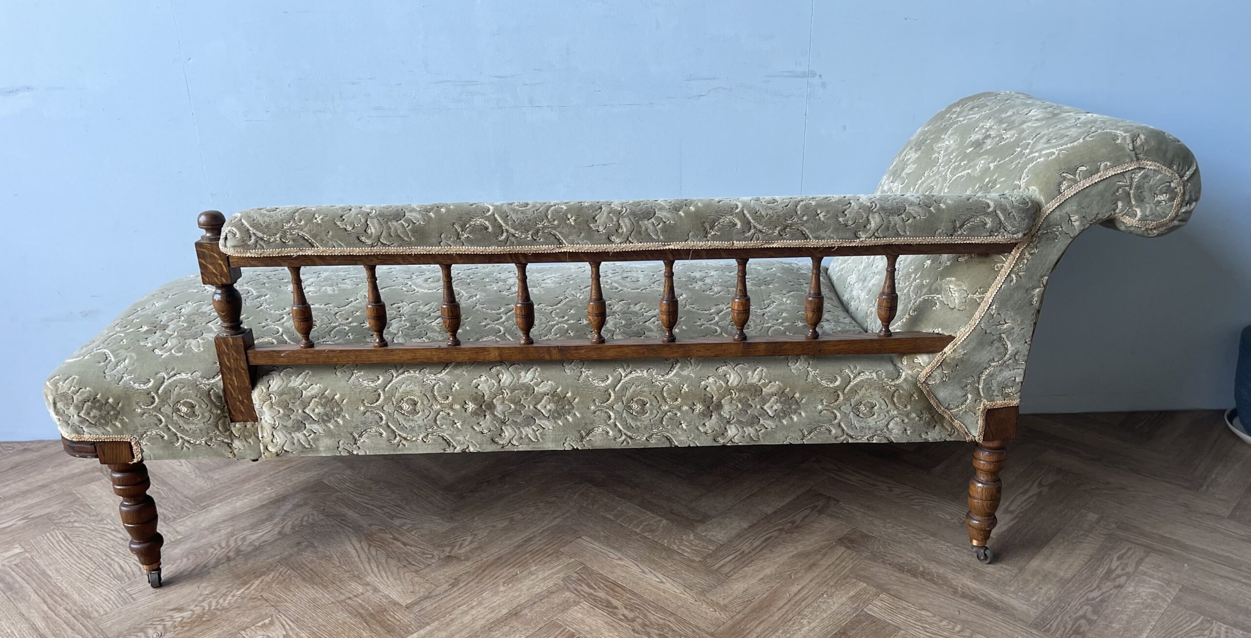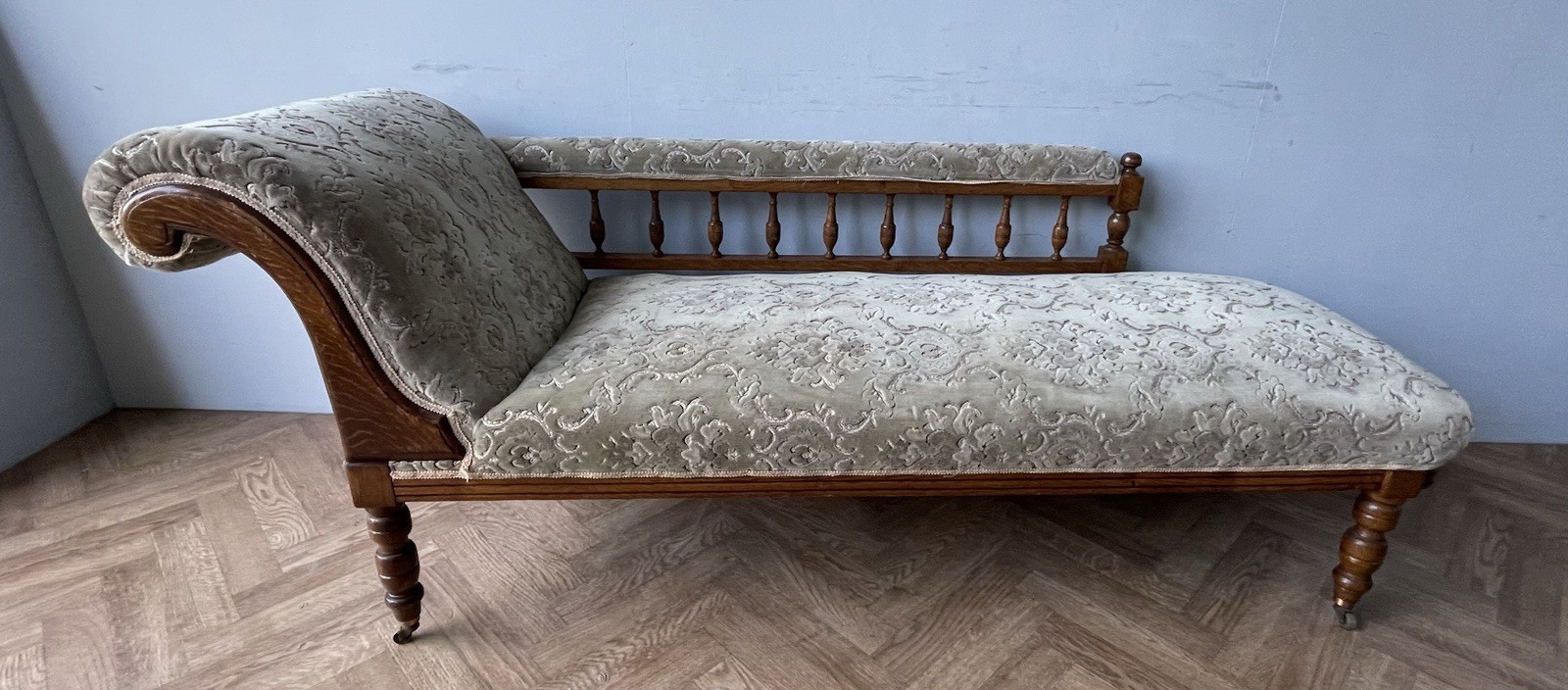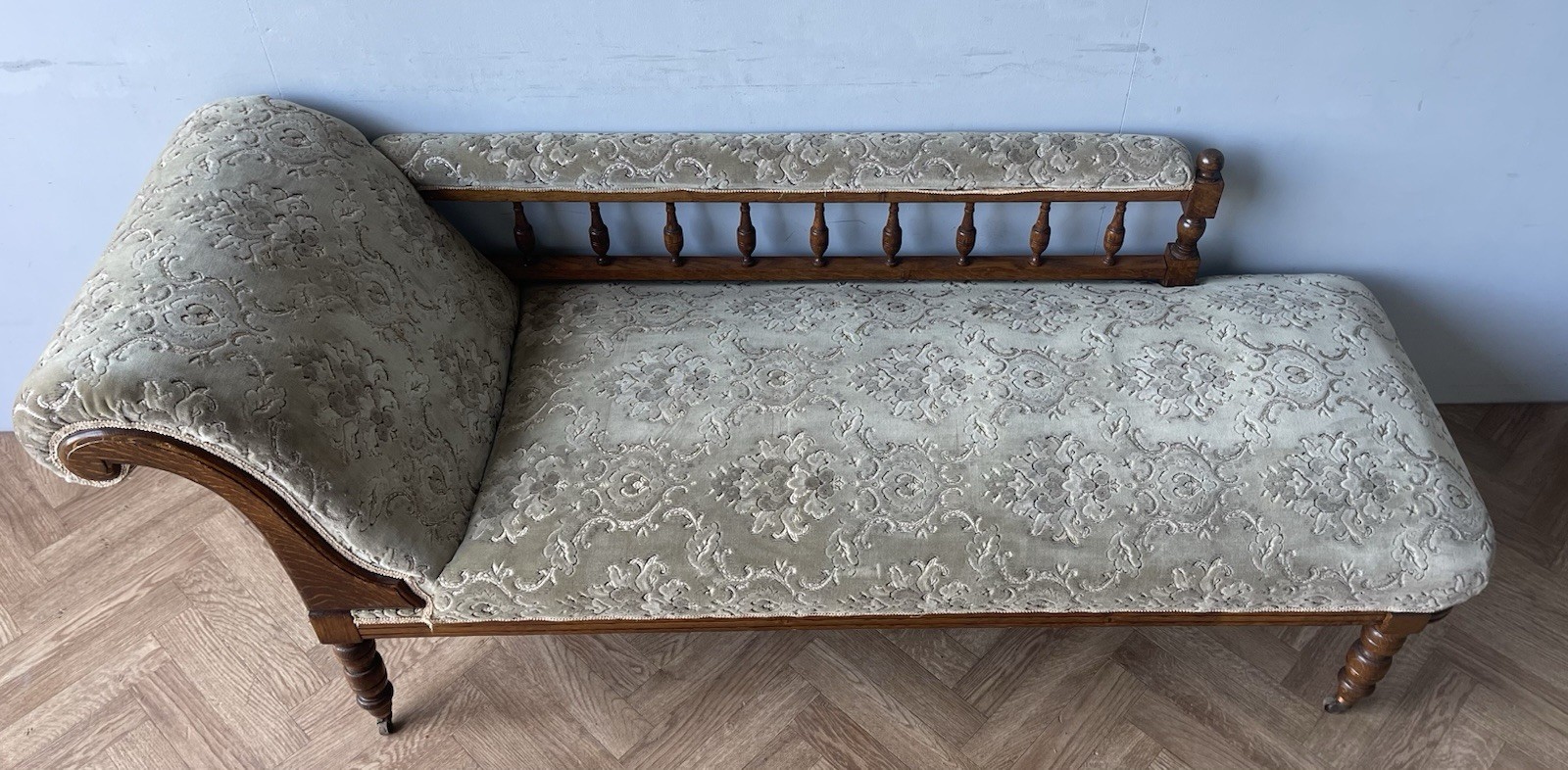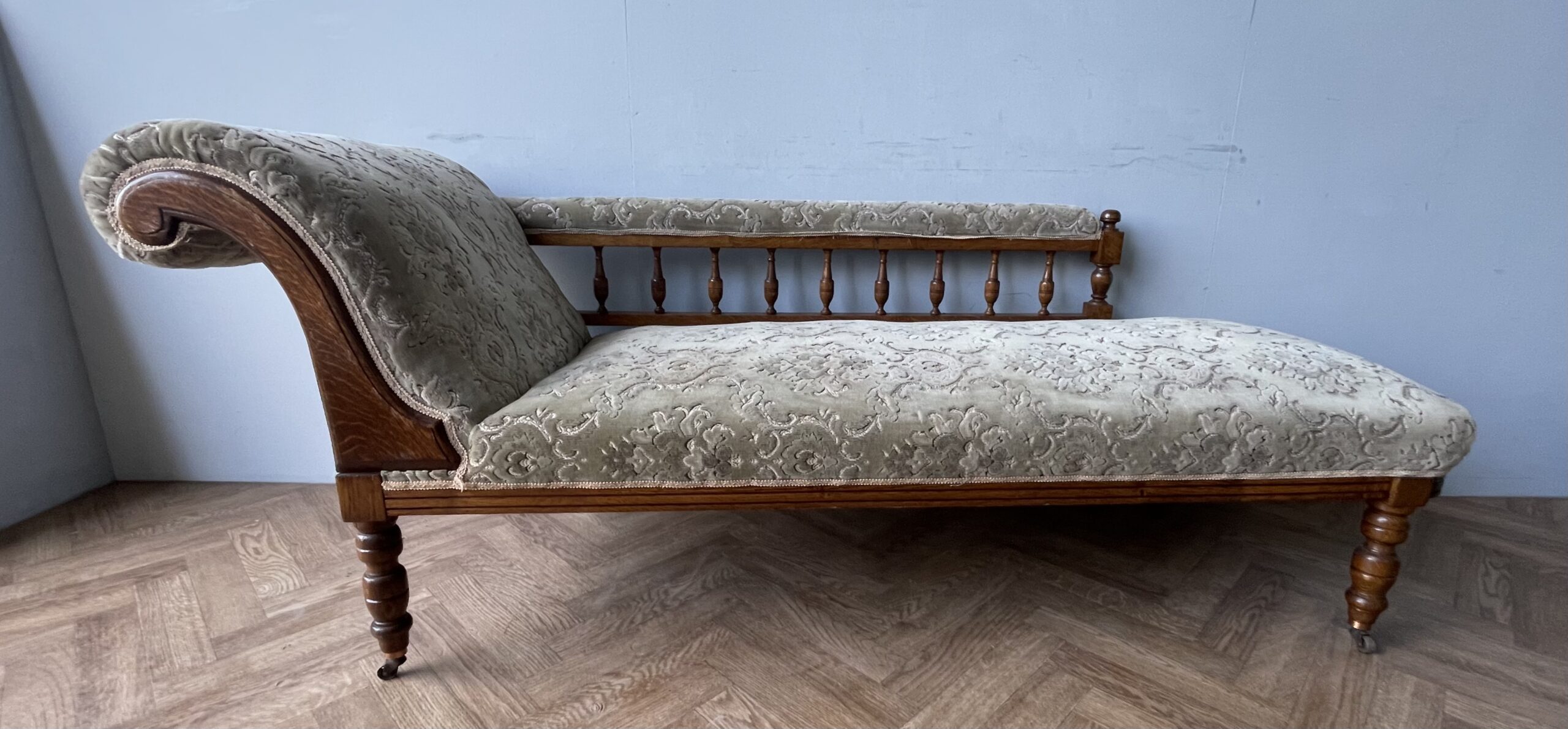 Vintage Gorgeous Edwardian Chaise Longue. A gorgeous daybed (they were originally known as fainting sofas!) with original green upholstery. It has a solid frame with a scrolled headrest, spindle back and turned legs on castors (which makes it easy to manoeuvre). A wonderful piece of statement furniture!