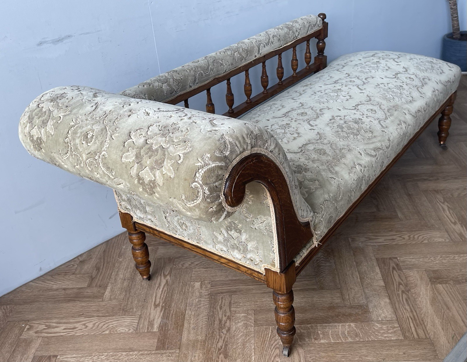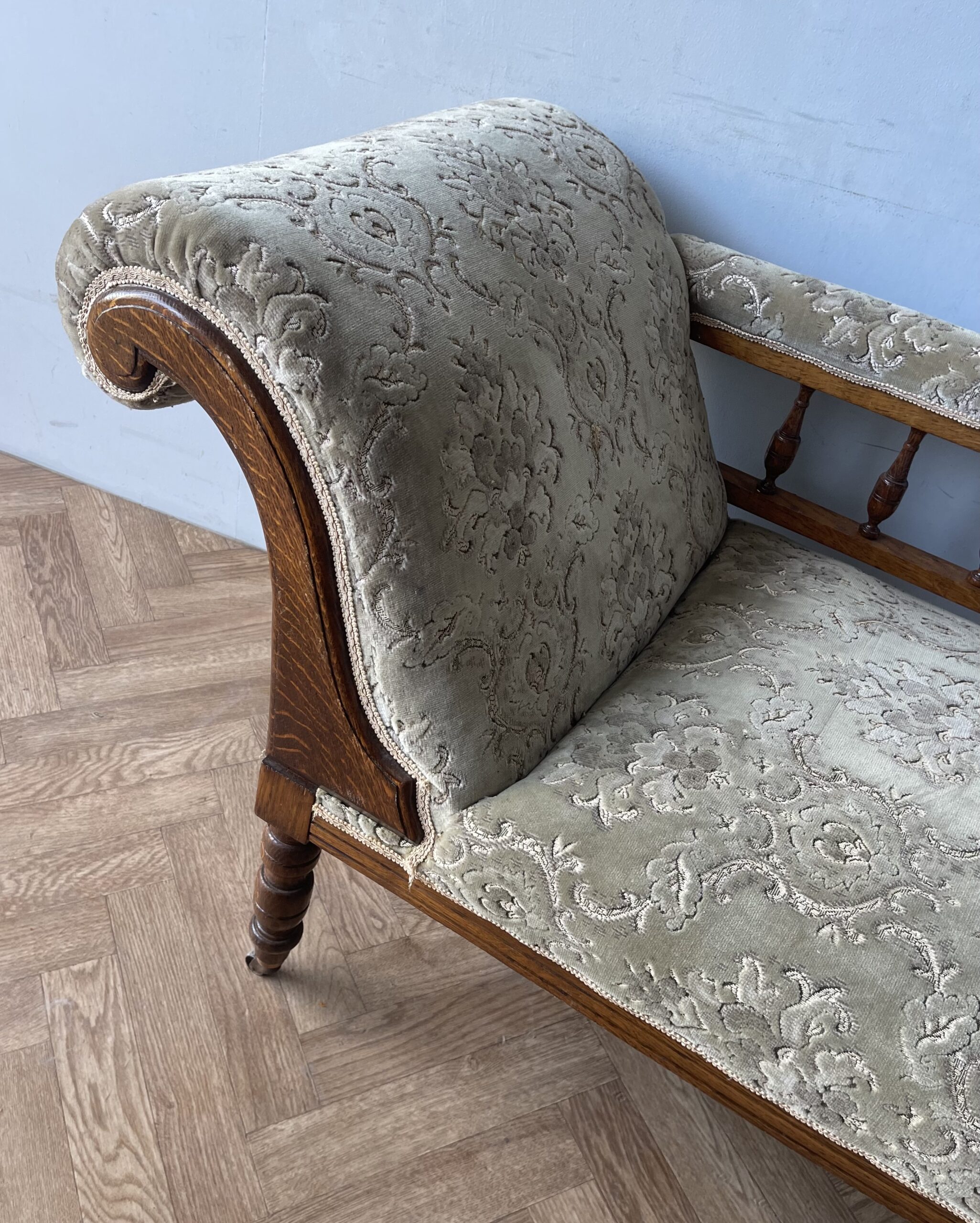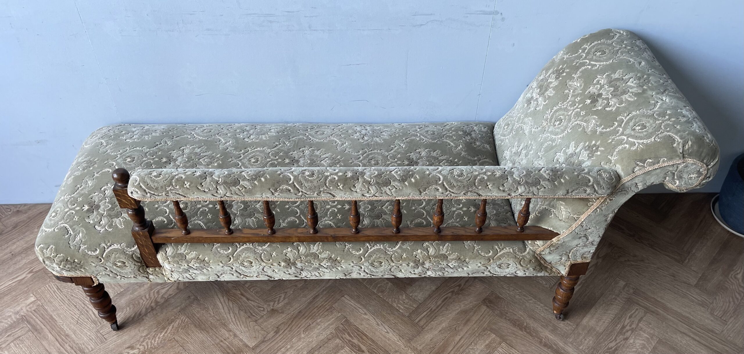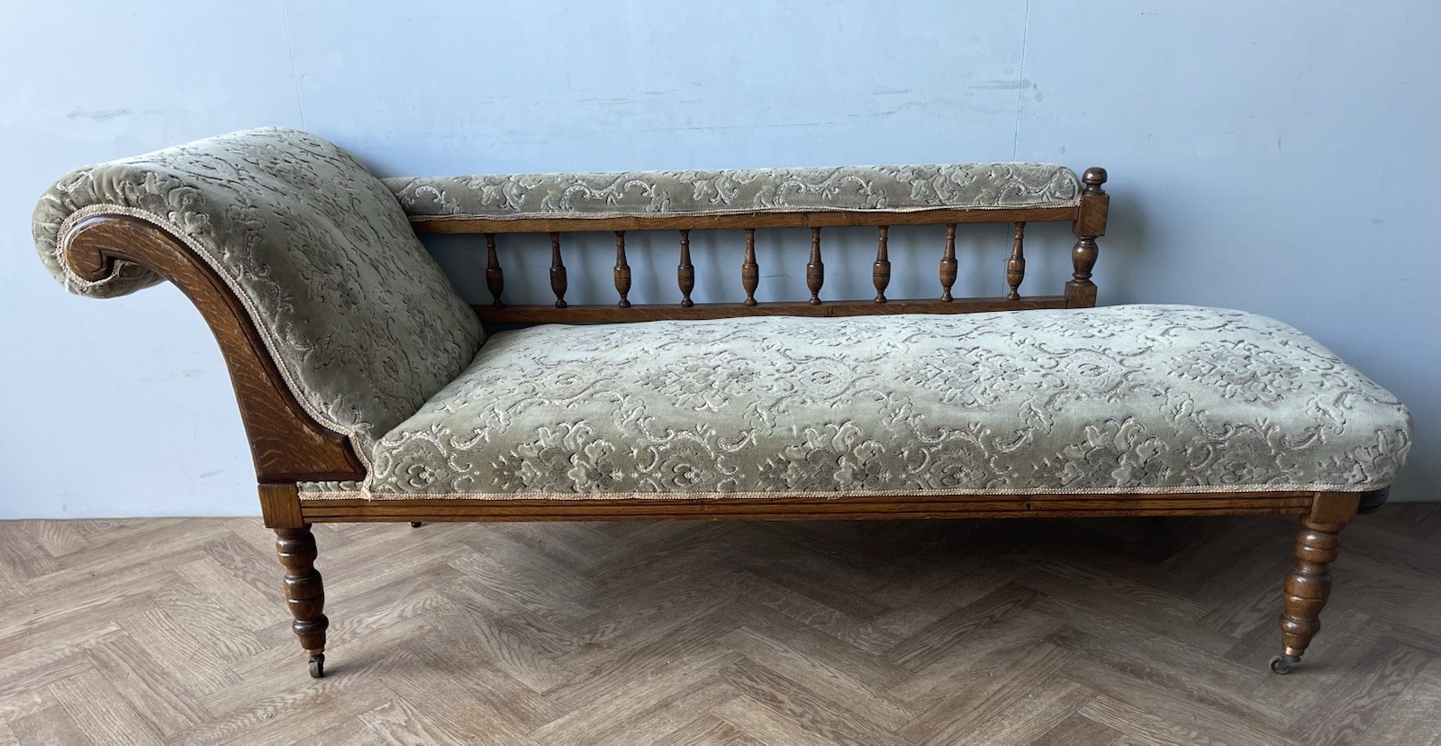Vintage Gorgeous Edwardian Chaise Longue. A gorgeous daybed (they were originally known as fainting sofas!) with original green upholstery. It has a solid frame with a scrolled headrest, spindle back and turned legs on castors (which makes it easy to manoeuvre). A wonderful piece of statement furniture!