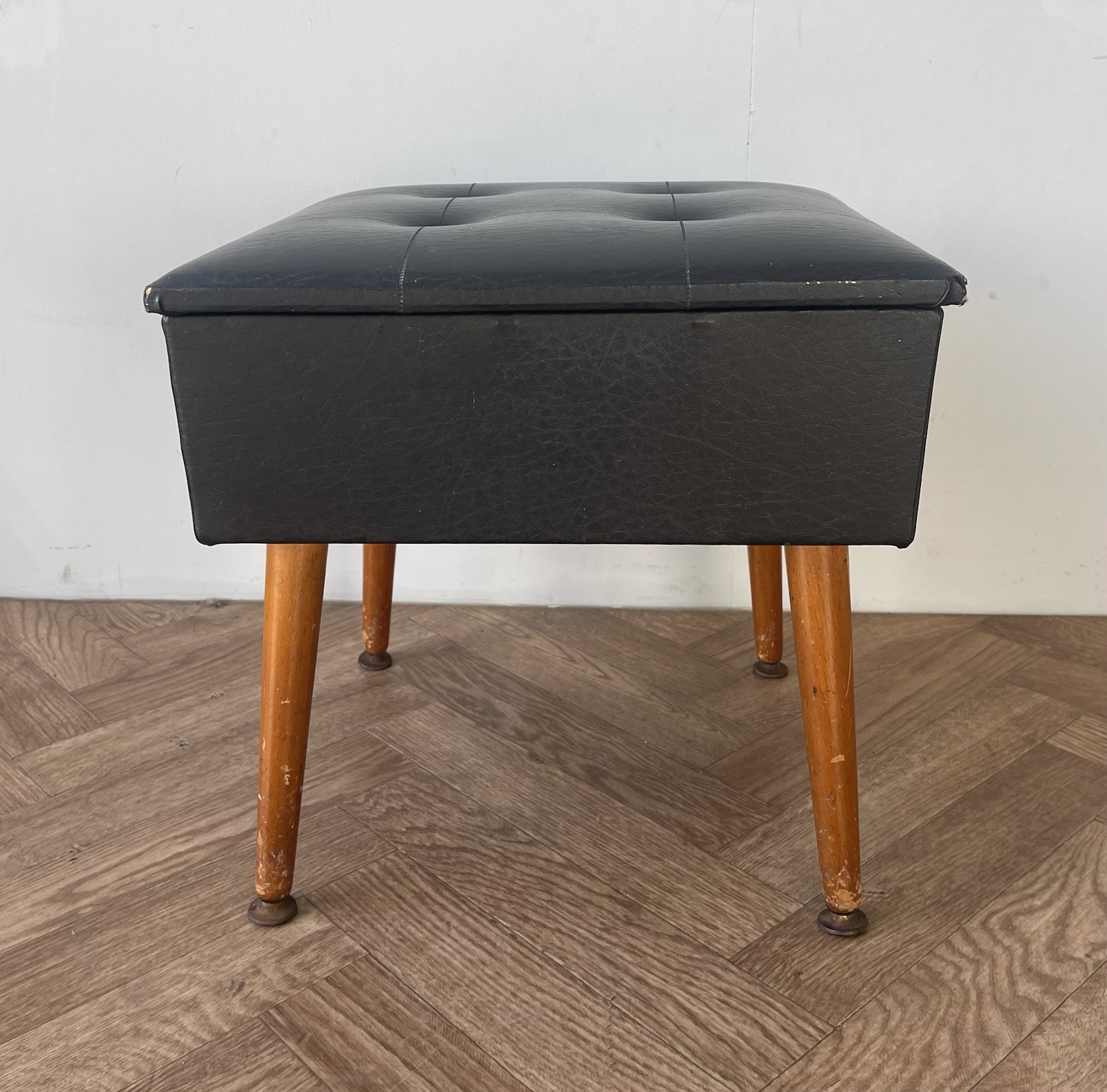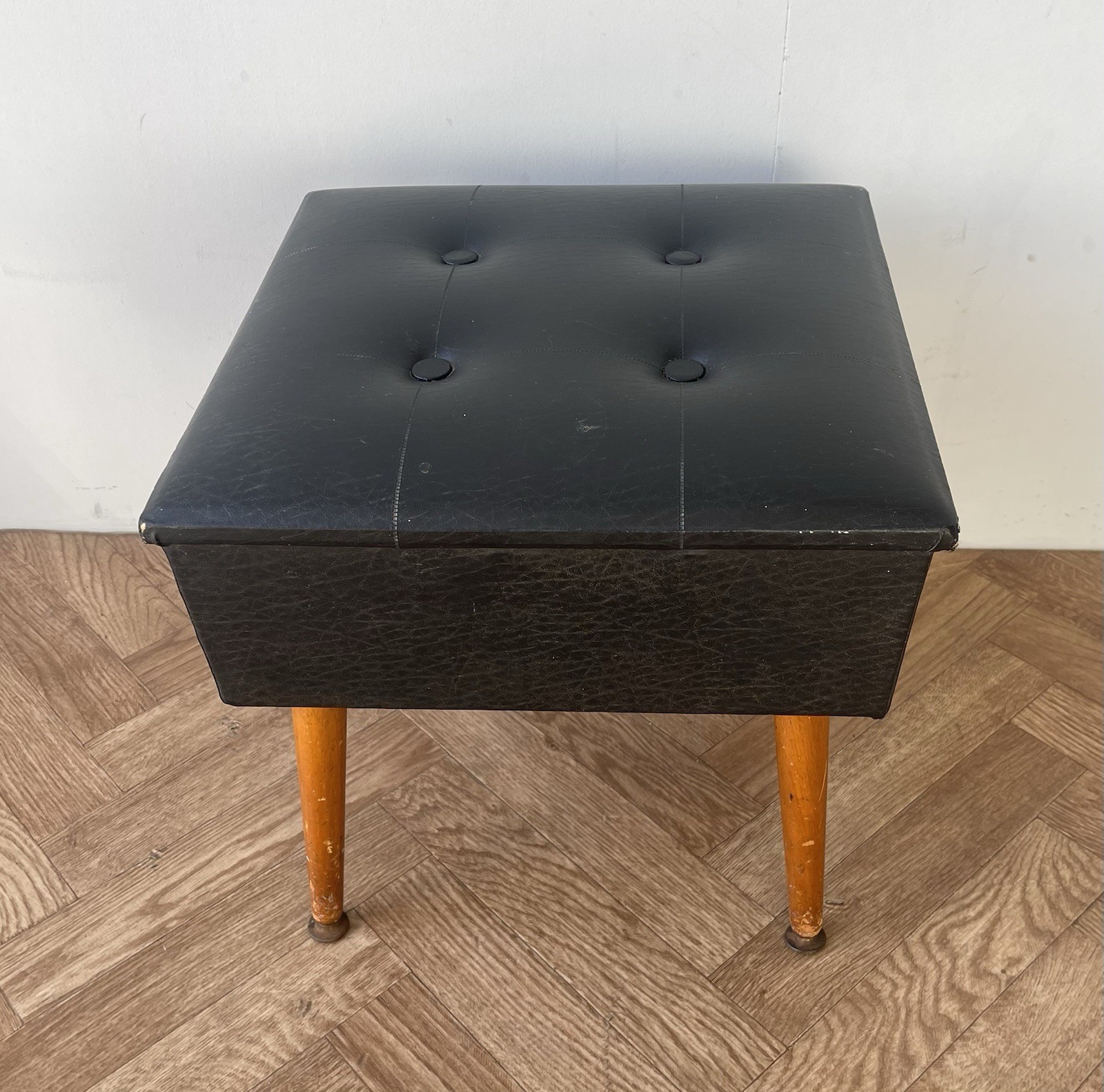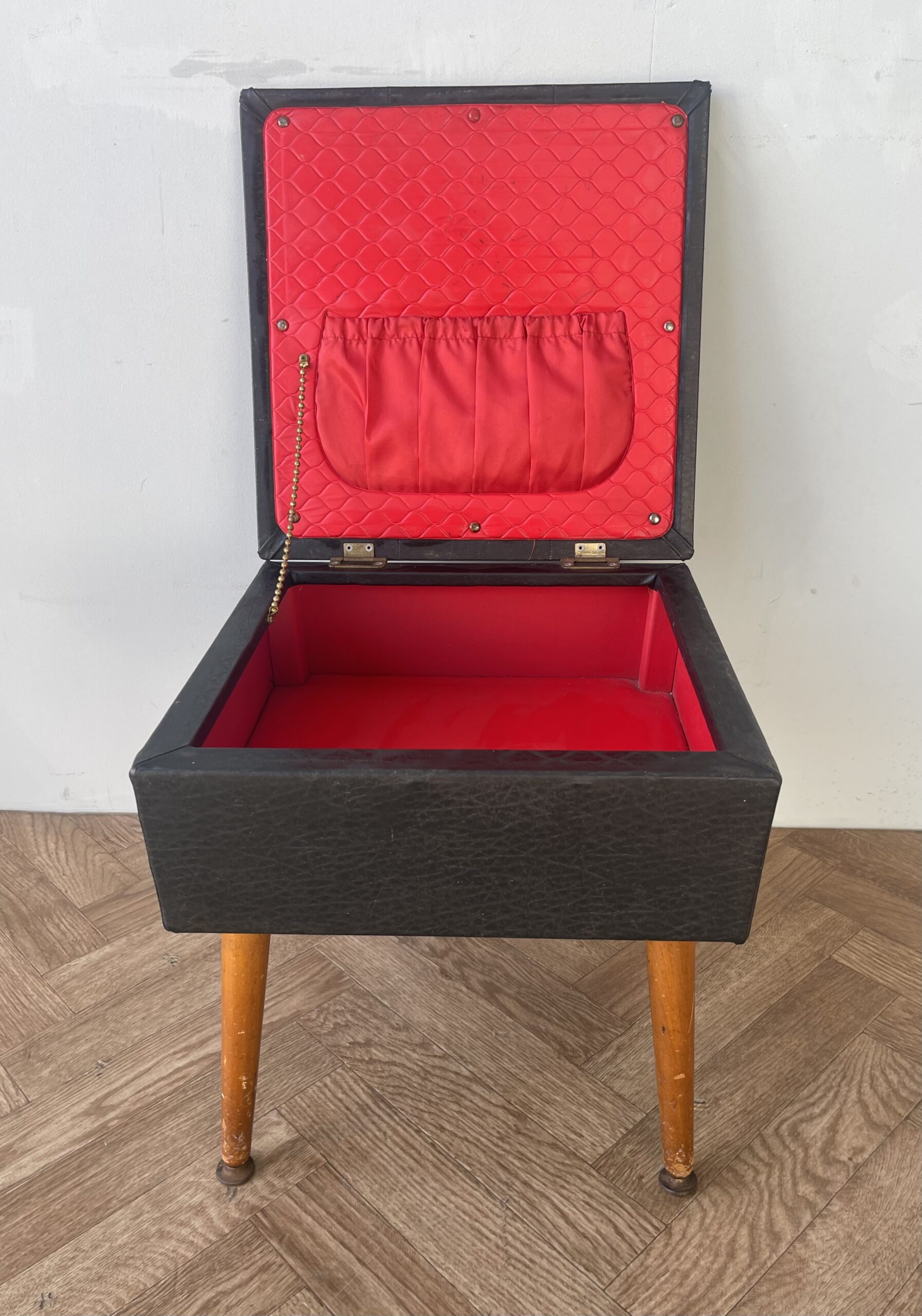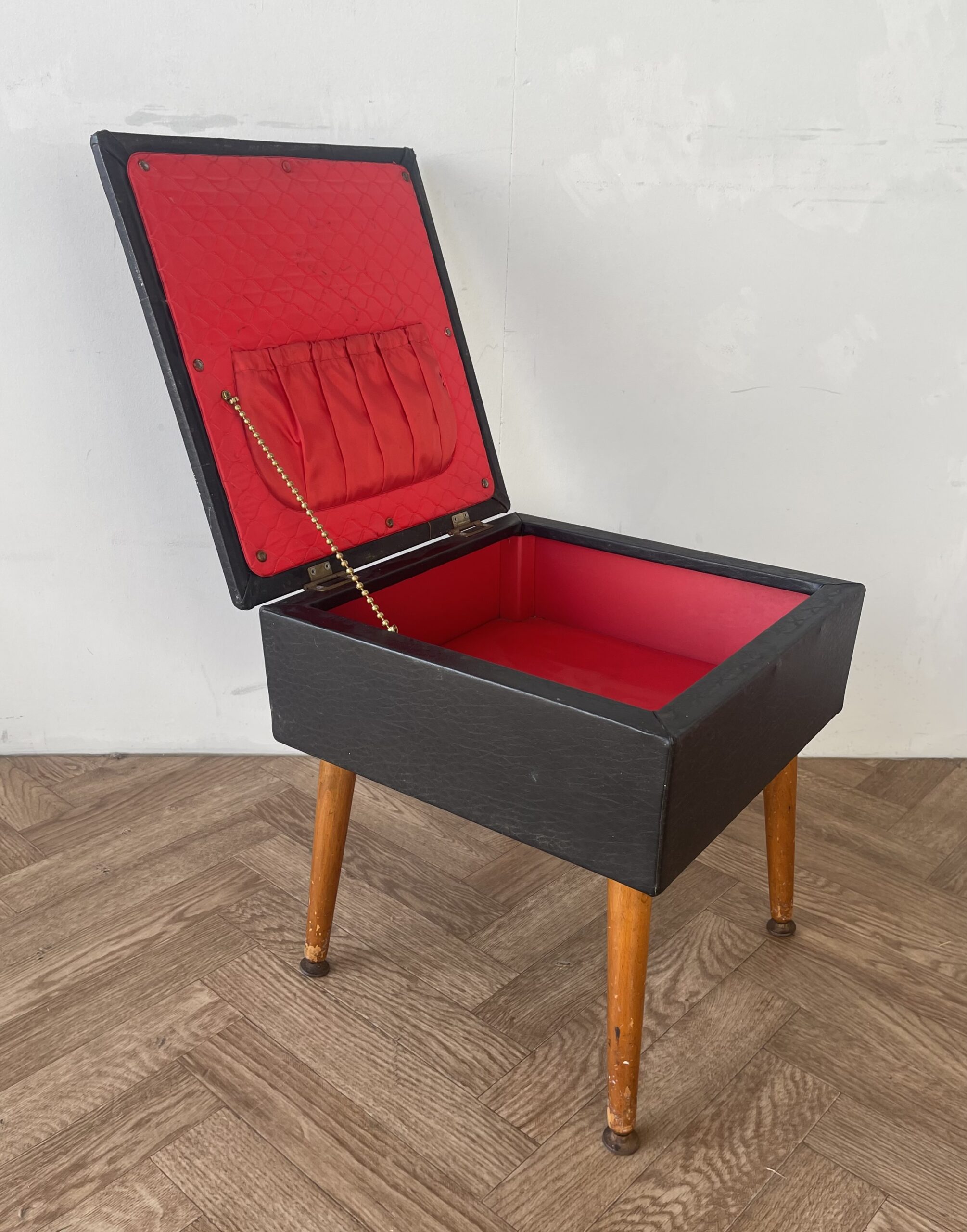 Vintage stylish large black vinyl sewing box /stool with red lining.