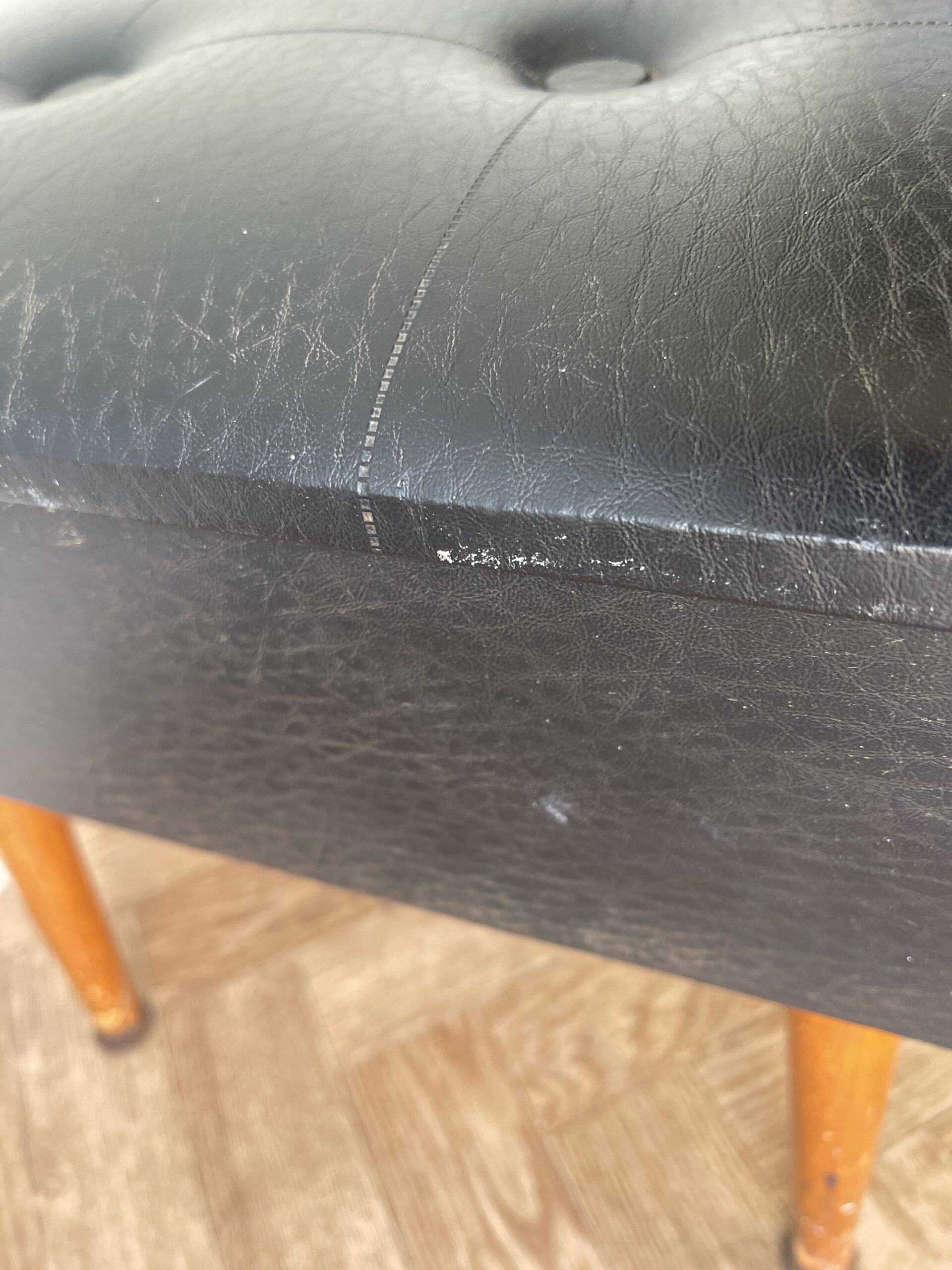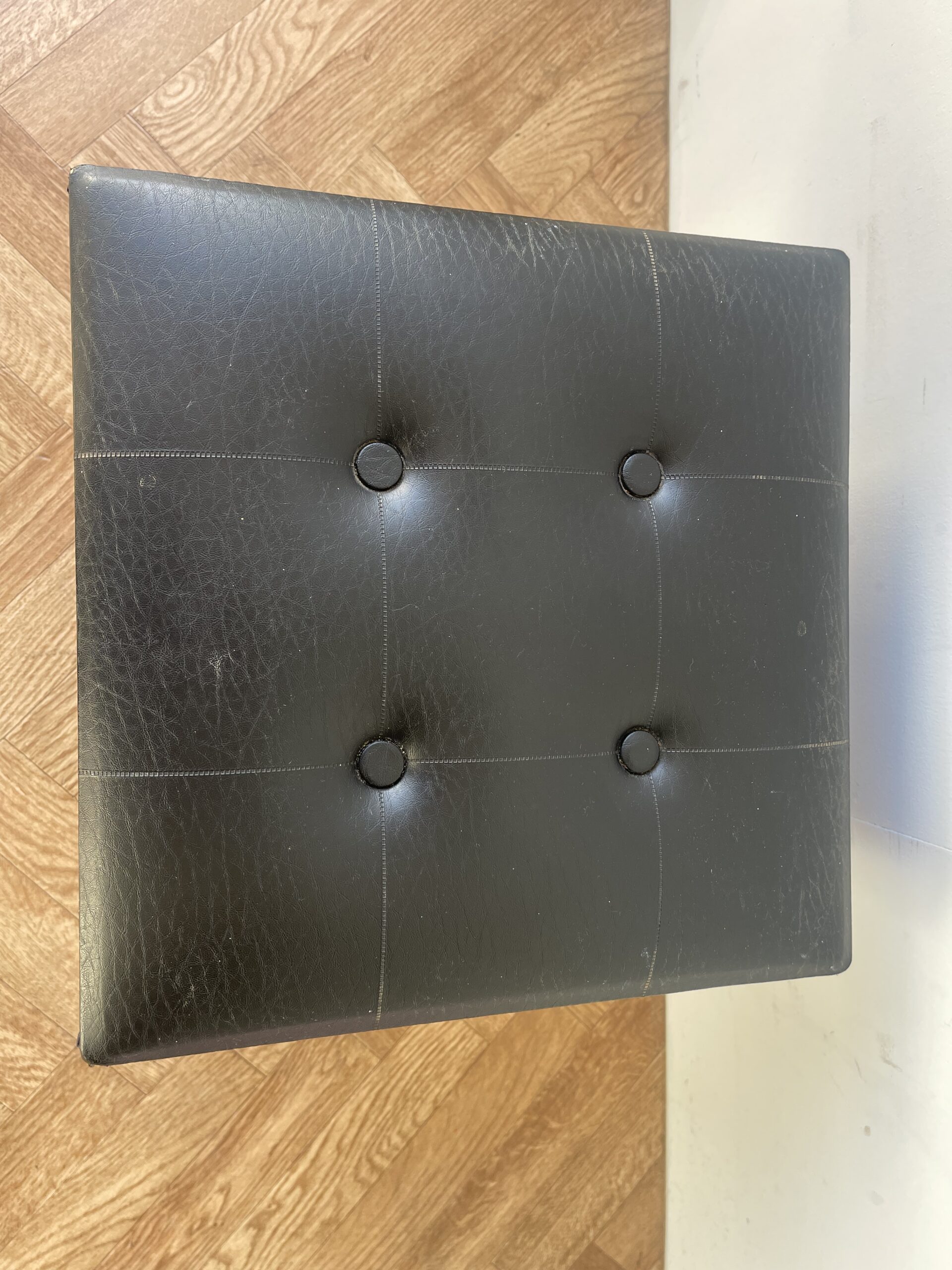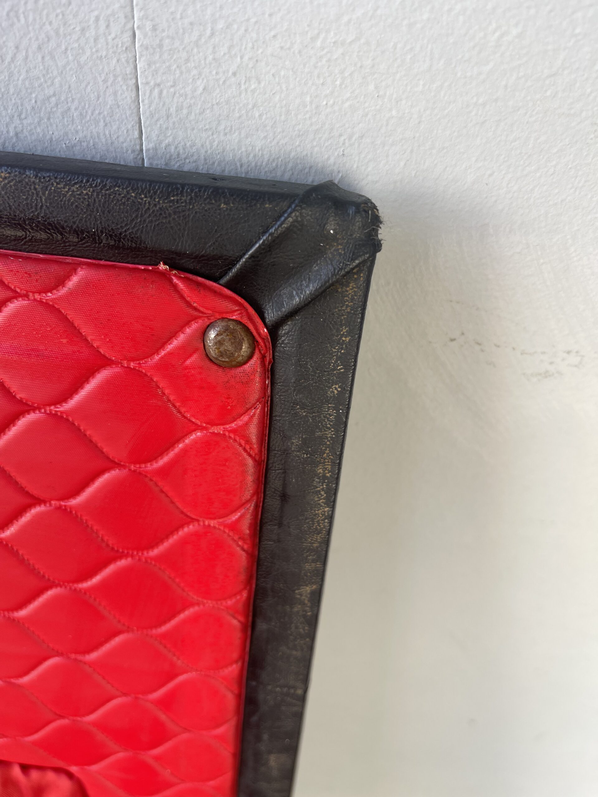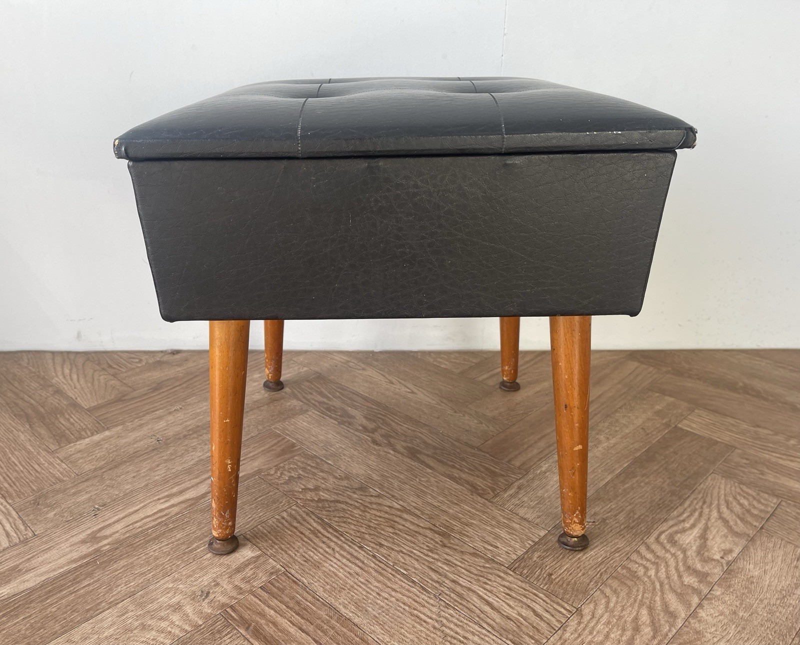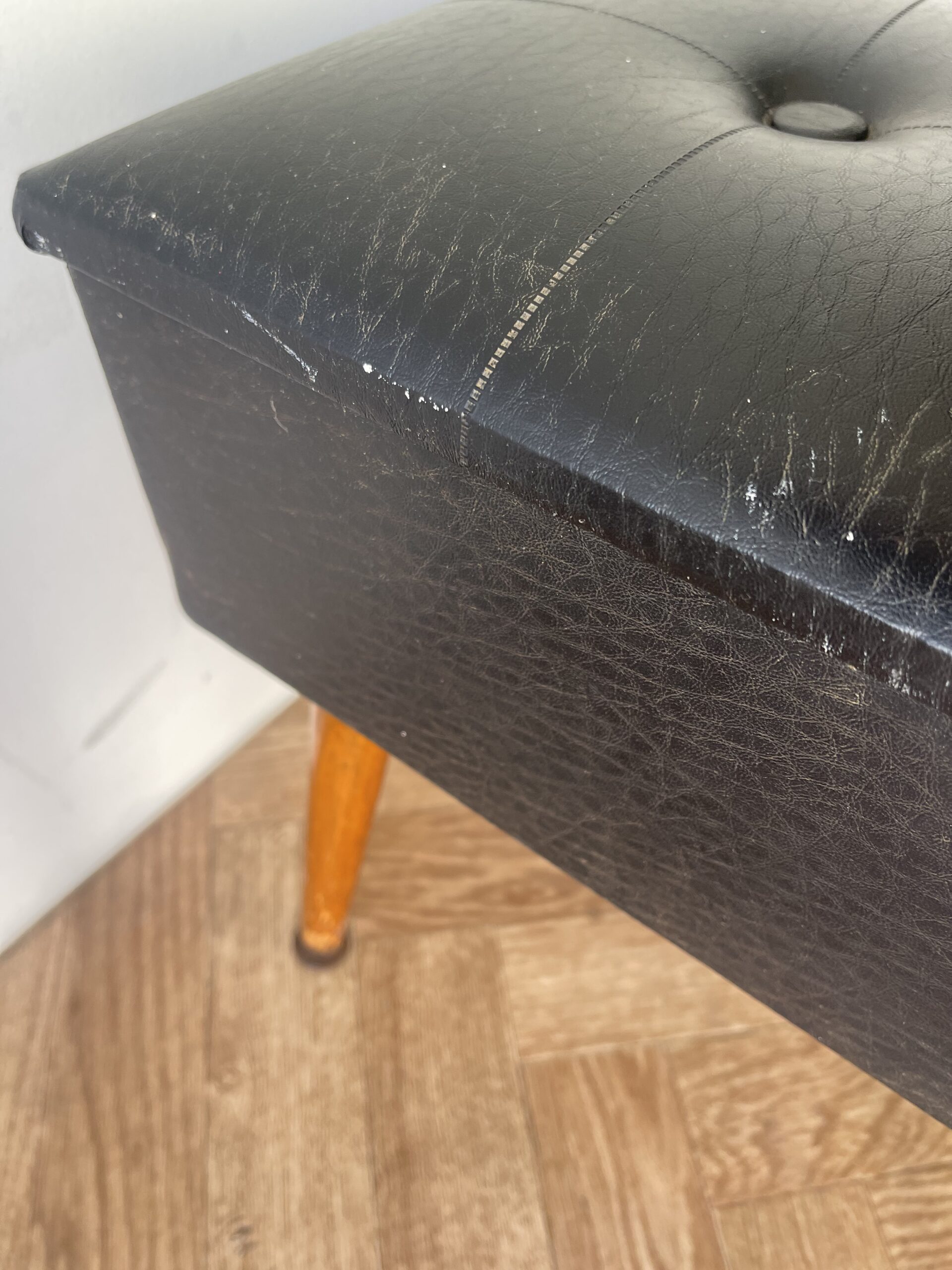 Vintage stylish large black vinyl sewing box /stool with red lining.