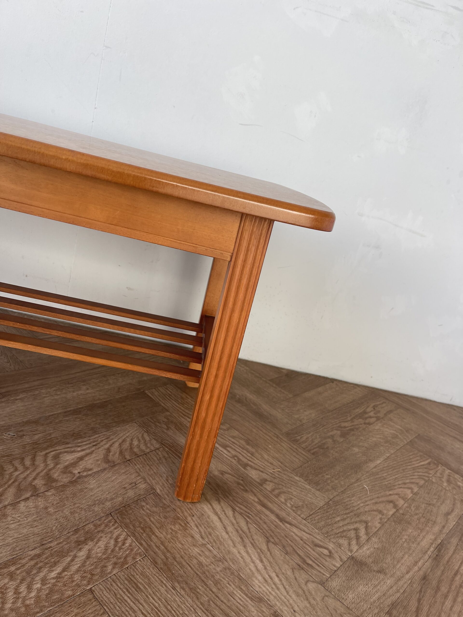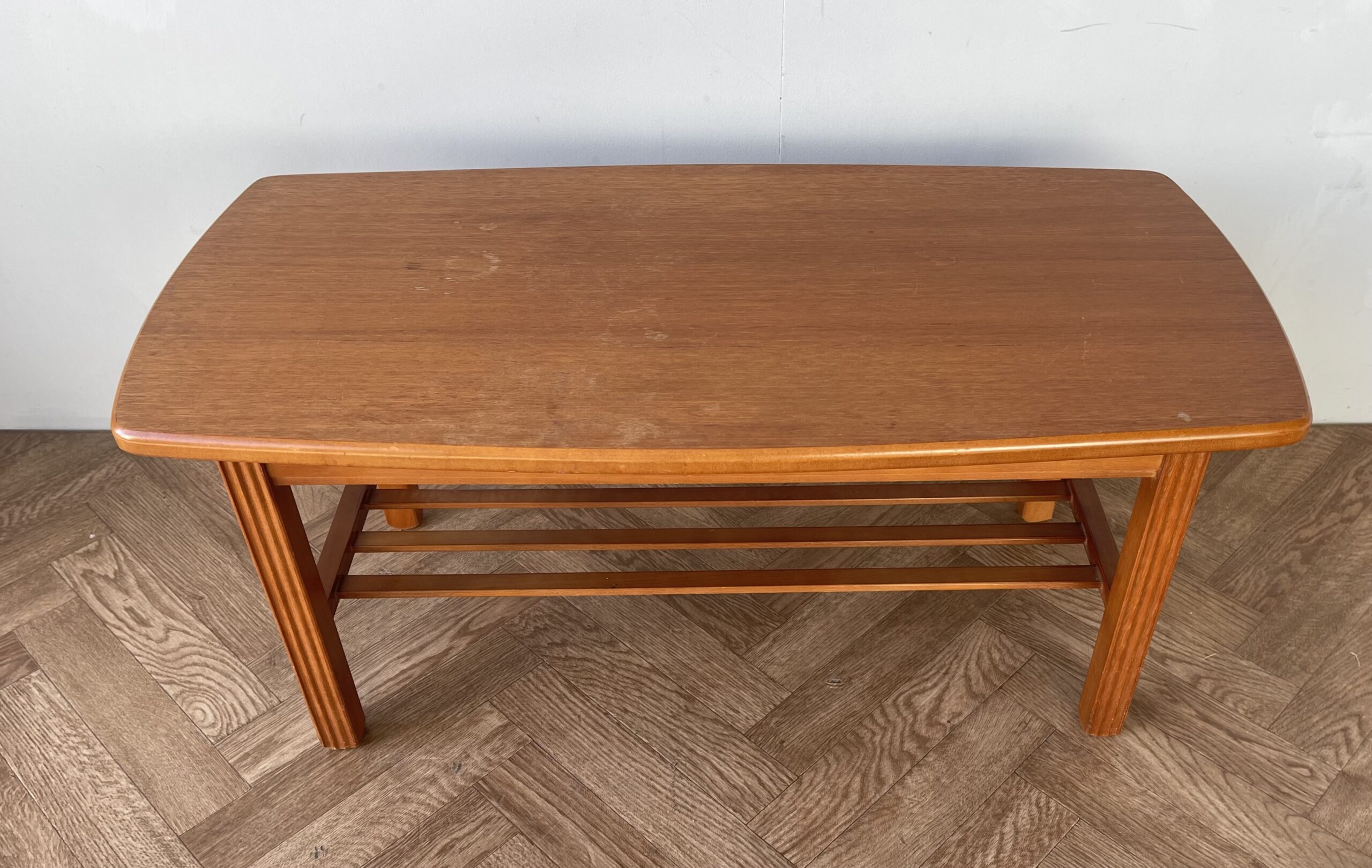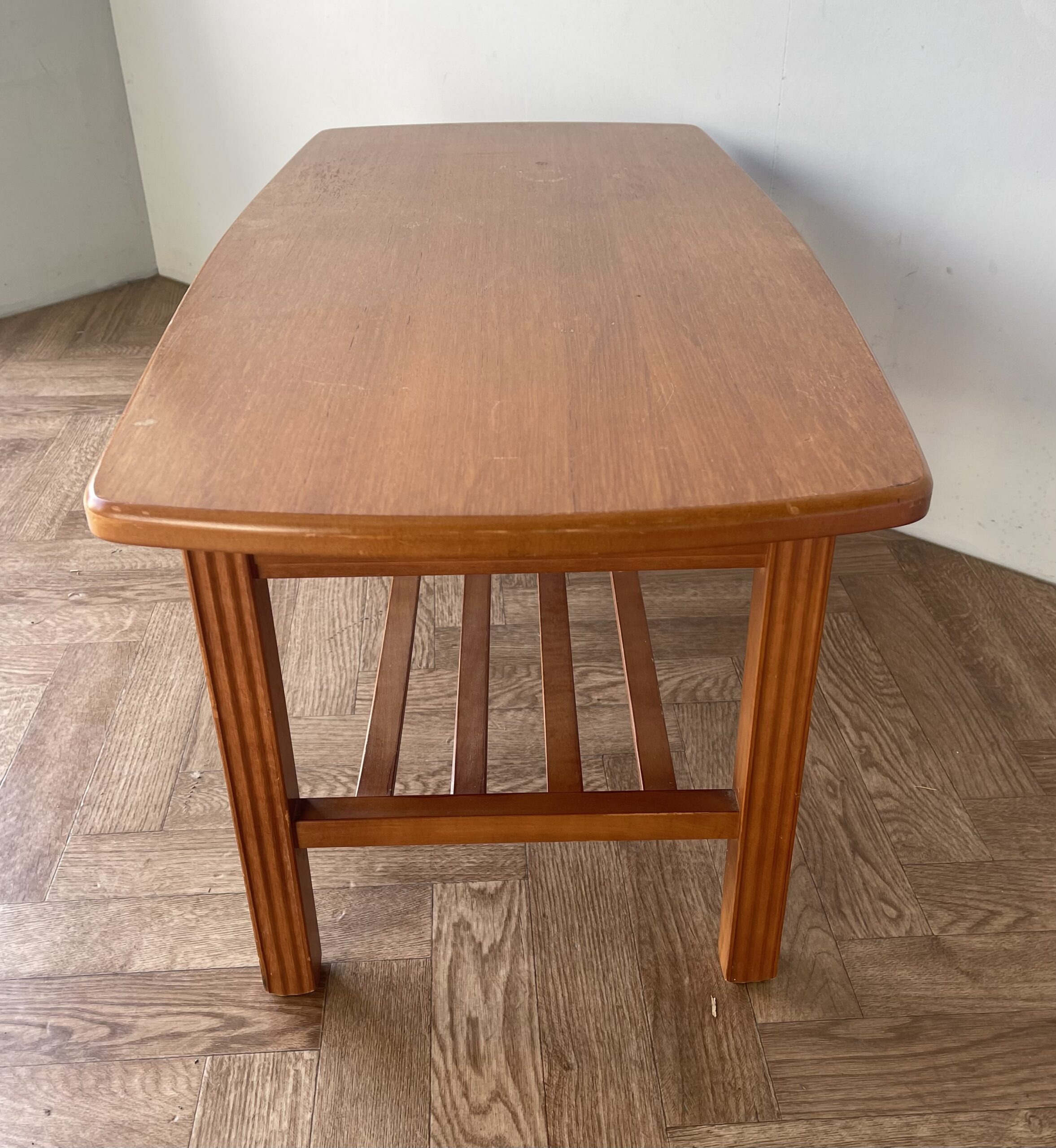 Vintage stylish large teak coffee table with shelf.